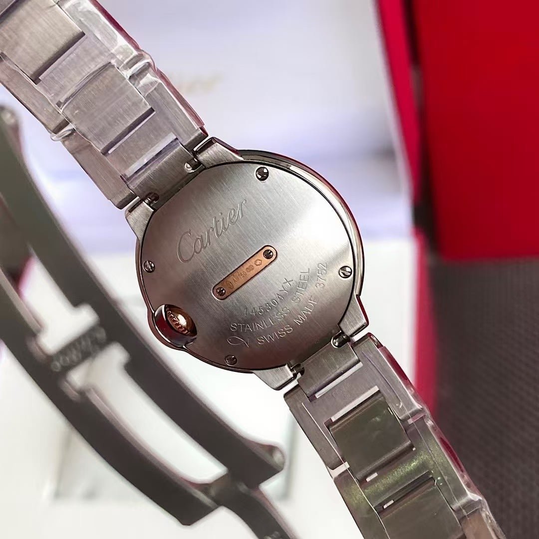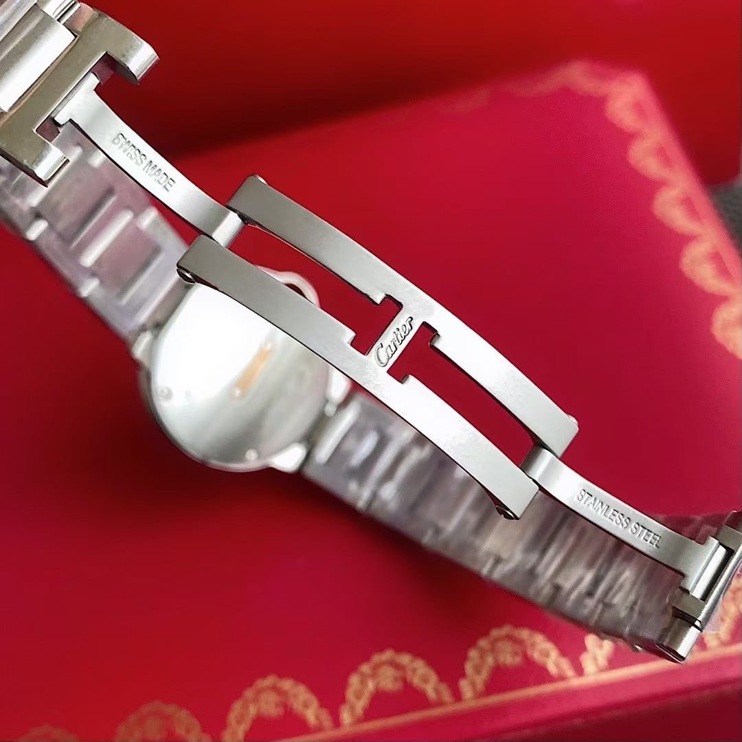 The stainless-steel bracelet features alternating satin and mirror polish, maintaining Cartier’s signature contrast. The butterfly clasp closes with a satisfying click and has engraved “CARTIER” branding identical in font and spacing to the authentic model.