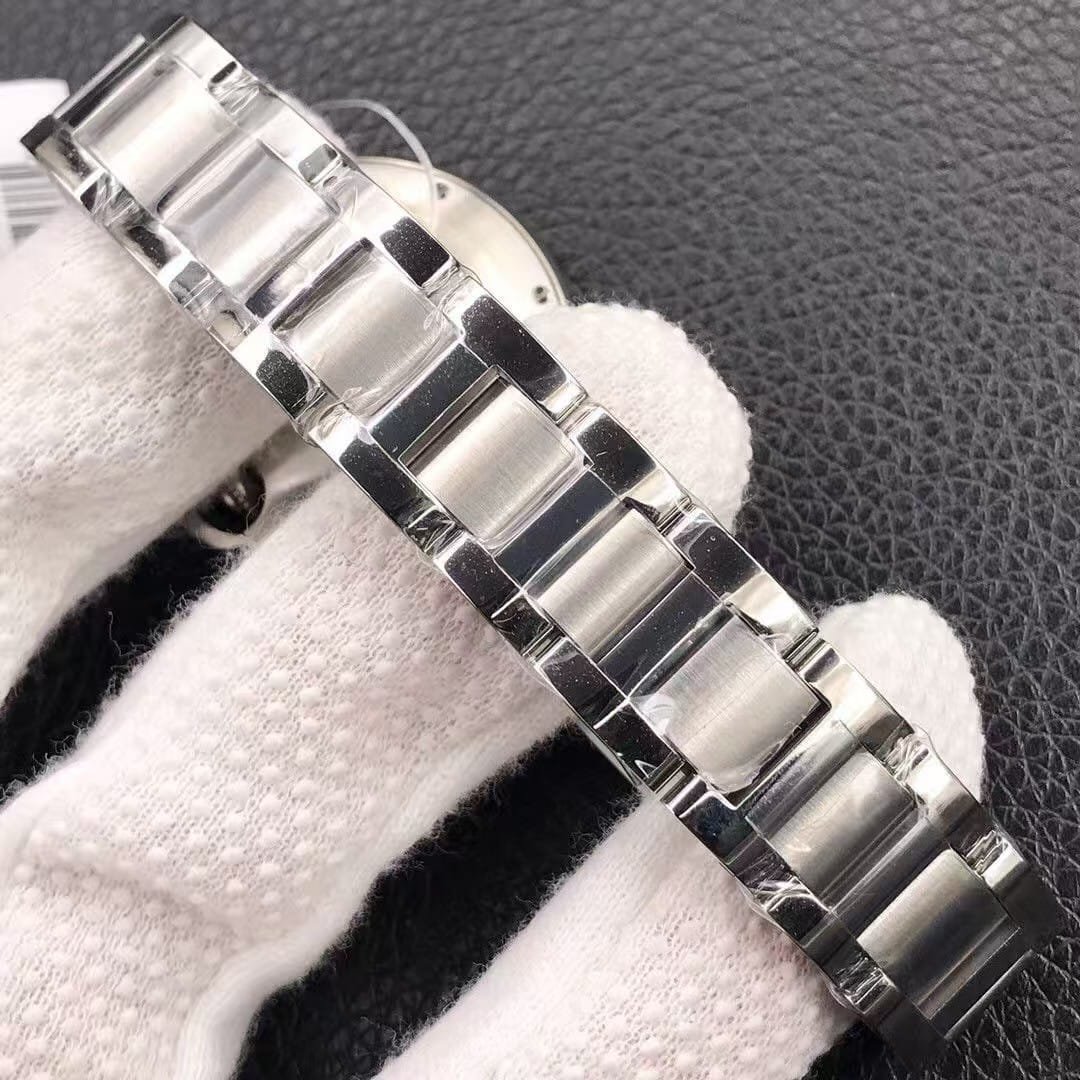 The stainless-steel bracelet matches the genuine Cartier aesthetic, alternating brushed center links with polished edges. Every link is individually CNC-milled and ultrasonically cleaned before assembly.