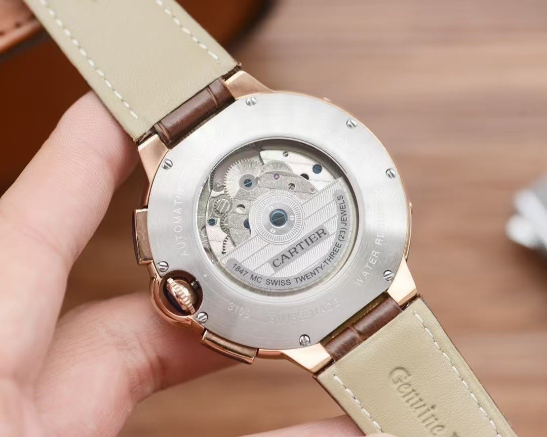• Decoration: Geneva stripes, polished bridges, laser-engraved “CARTIER” plate