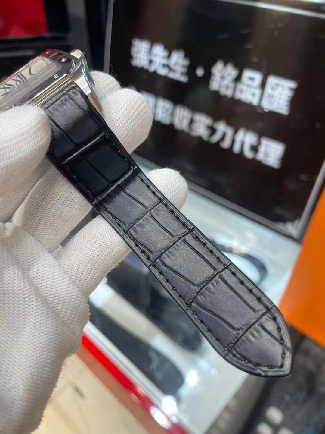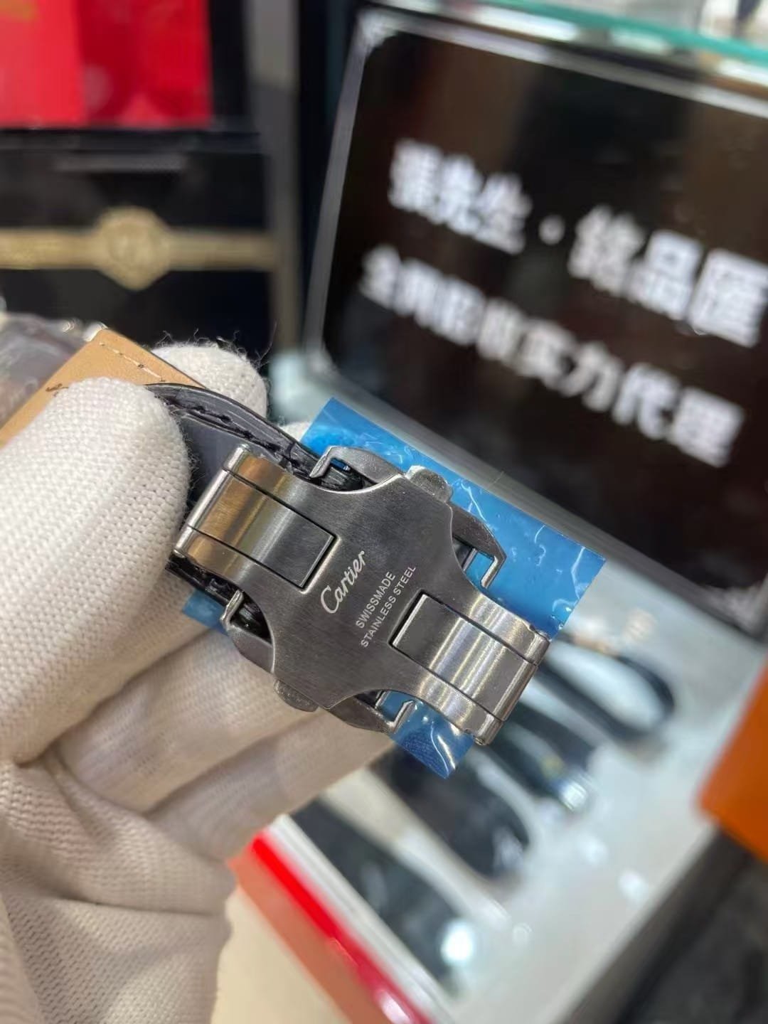 The black alligator-pattern leather strap enhances the watch’s bold geometry while keeping it grounded in Cartier tradition. It’s thick, glossy, and stitched with precision, ending in a polished folding clasp engraved with micro-detailed Cartier markings.