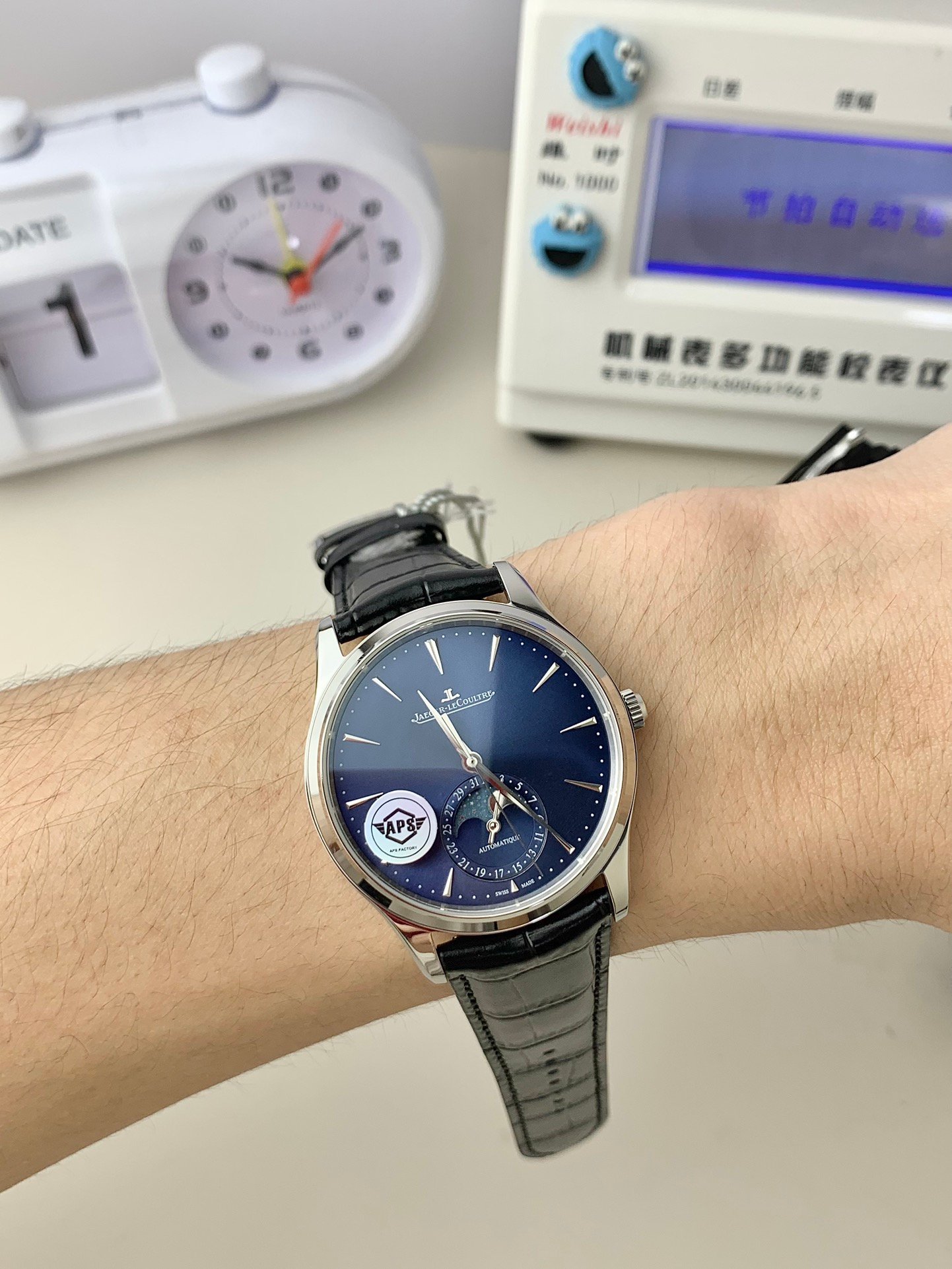 This Jaeger-LeCoultre Master Moon Phase watch (model Q1368480) is produced by the APS factory. It features a 39mm diameter dial and a strap made of imported Italian calfskin. The movement is a custom-designed 925 integrated movement, renowned for its exceptional stability. Please enjoy and appreciate its value.
