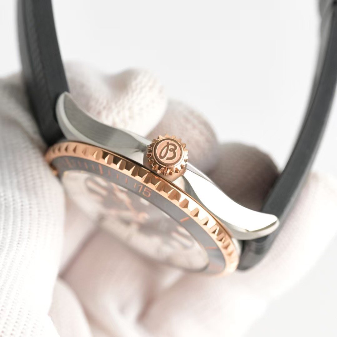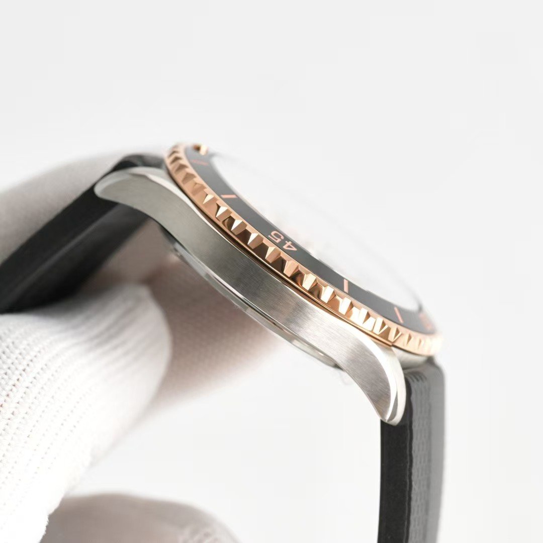 The black-and-rose Superocean from BLS Factory isn’t trying to look luxurious; it just behaves that way. The rose-gold accents don’t flood your eye. They show up in small pulses — the crown, the outer ring of the bezel, the hands — enough to shift the tone from “tool diver” to something you’d still wear at dinner.