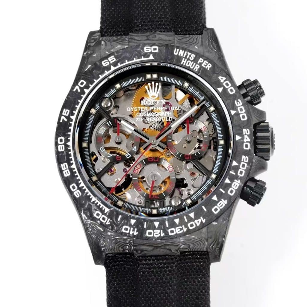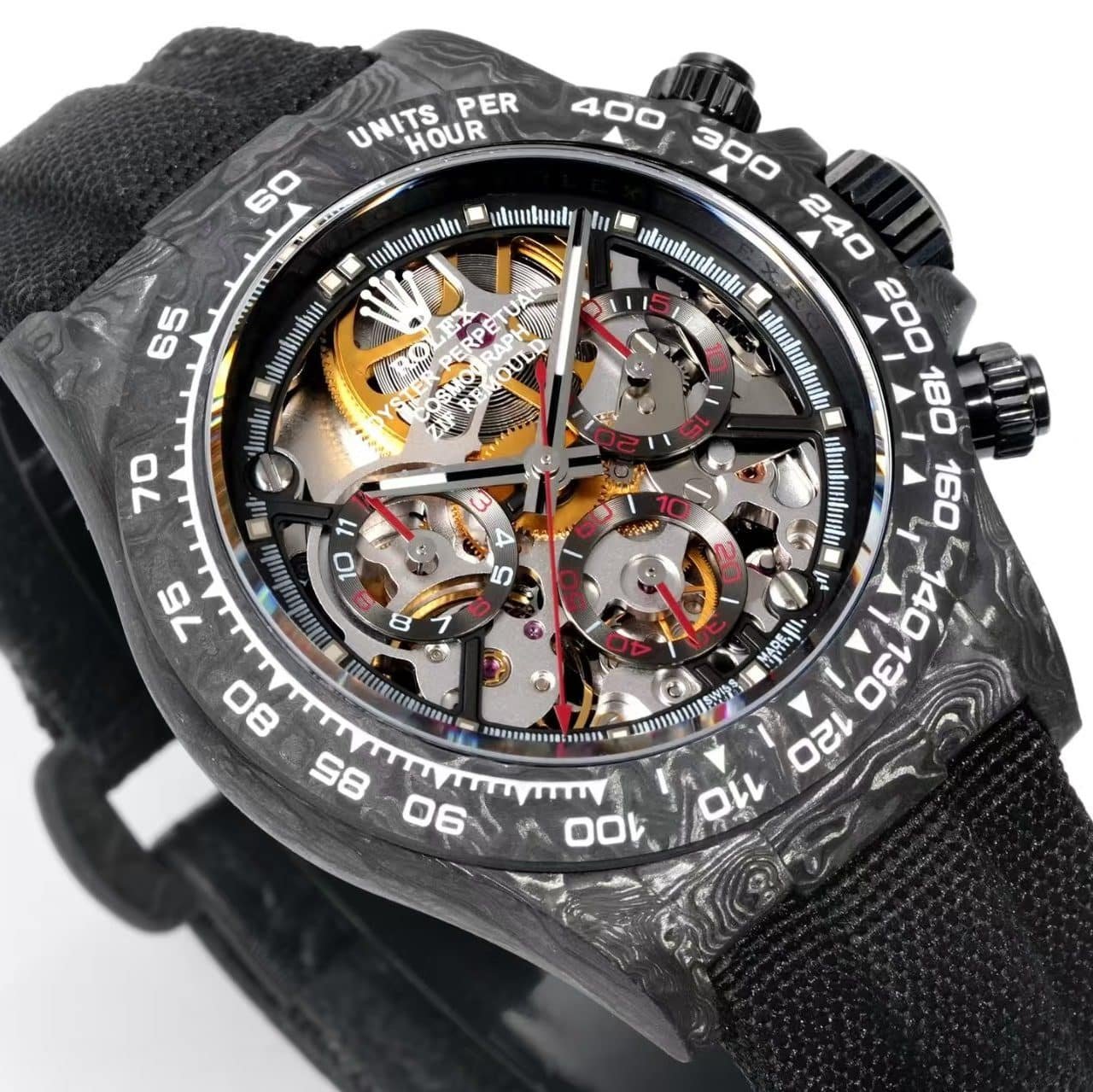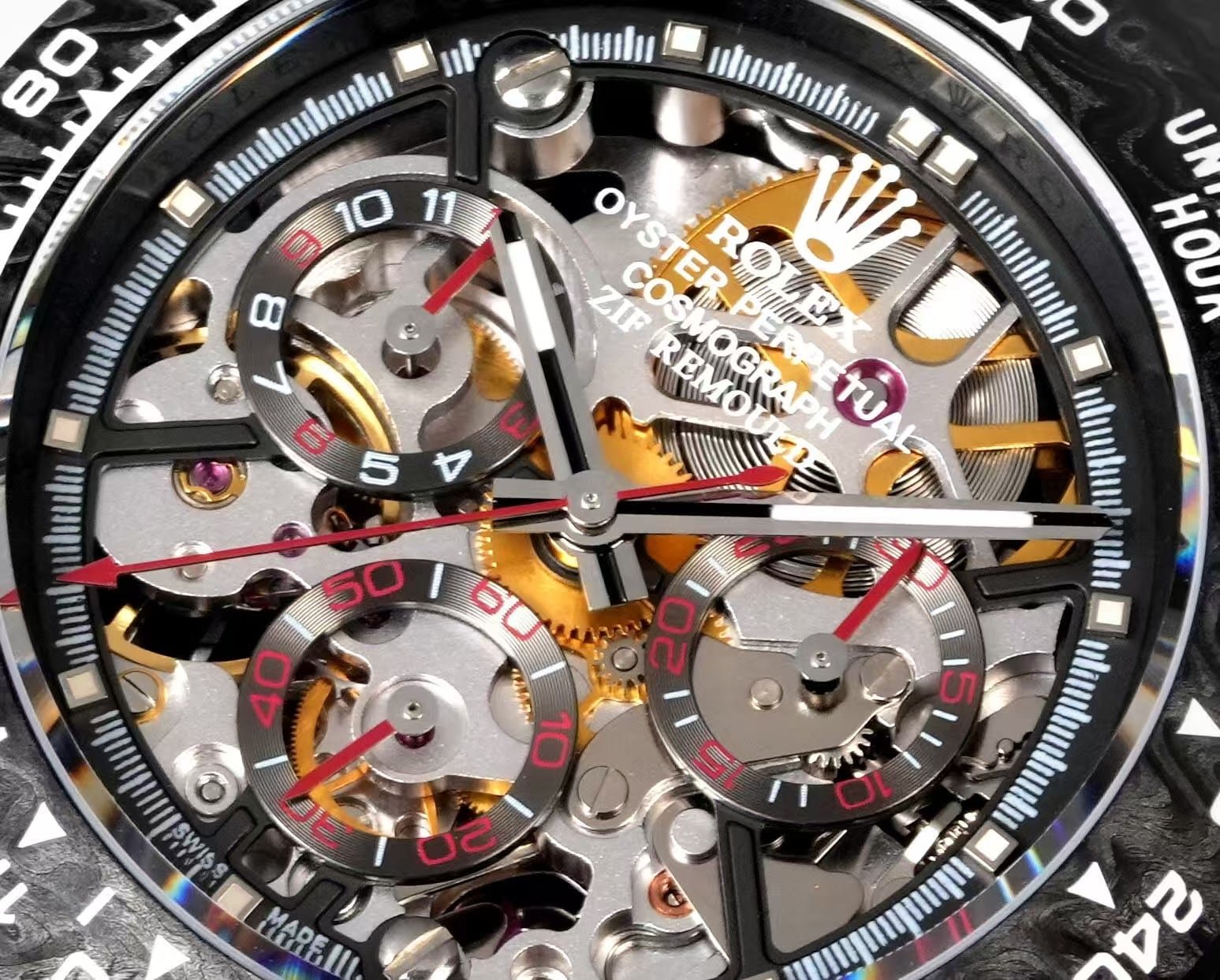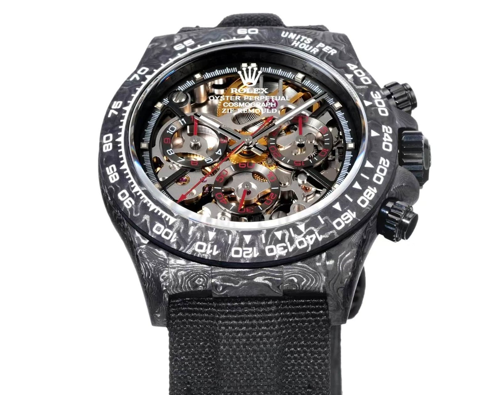 This carbon Daytona from VS Factory is not about being flashy — it’s about feel, structure, and daily wear comfort. The case is built from forged carbon fiber, not just for appearance, but for the way it changes the watch’s presence on the wrist. It wears lighter, warmer, and more natural than steel, and it carries a matte, woven depth that shifts gently in different light.