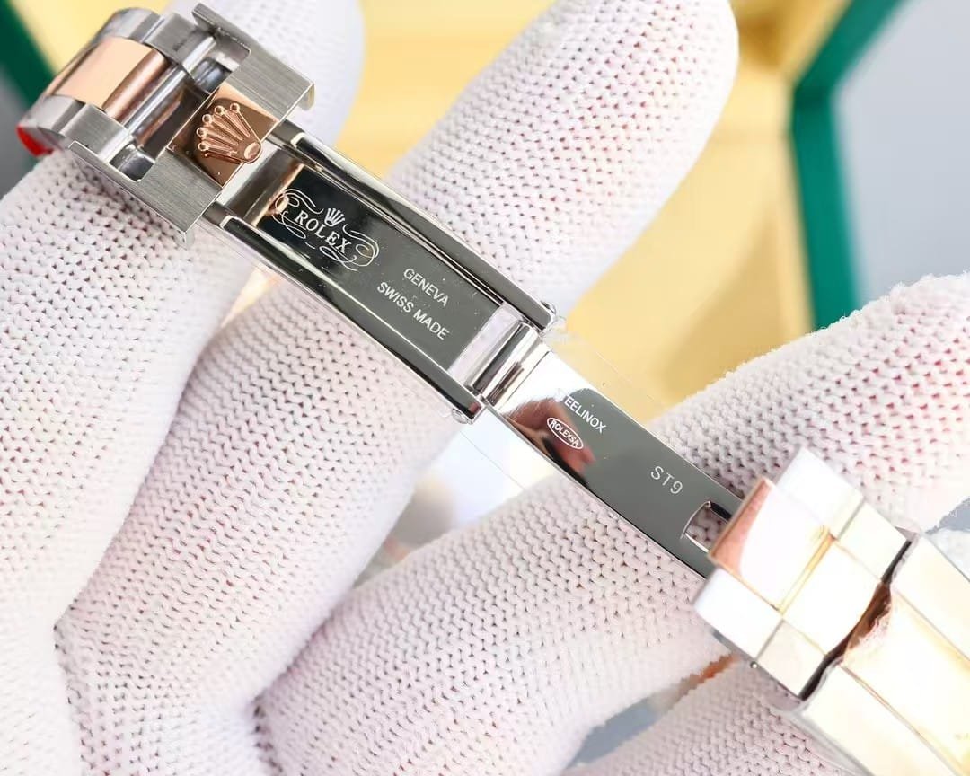 The Oyster bracelet blends brushed steel and polished Everose-plated center links, fitted with a Clean-engraved clasp identical to Rolex’s original safety system. The wrist feel is solid, balanced, and comfortable, matching the authentic model’s 44 g average weight variance tolerance.