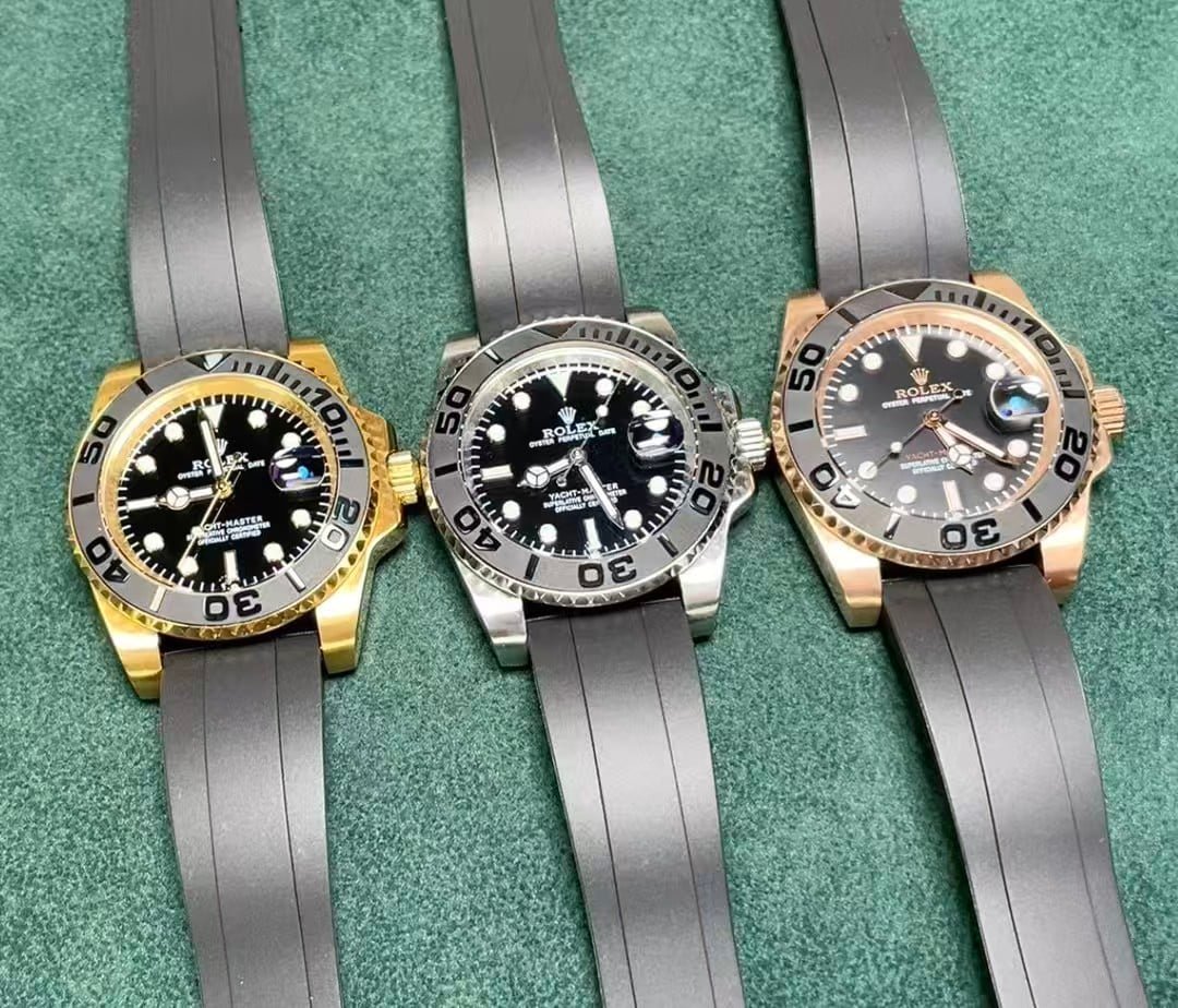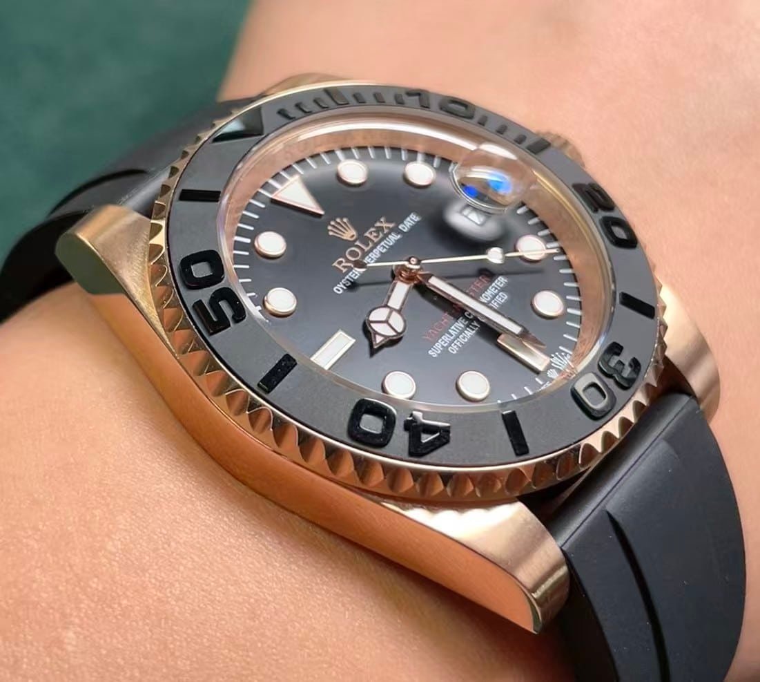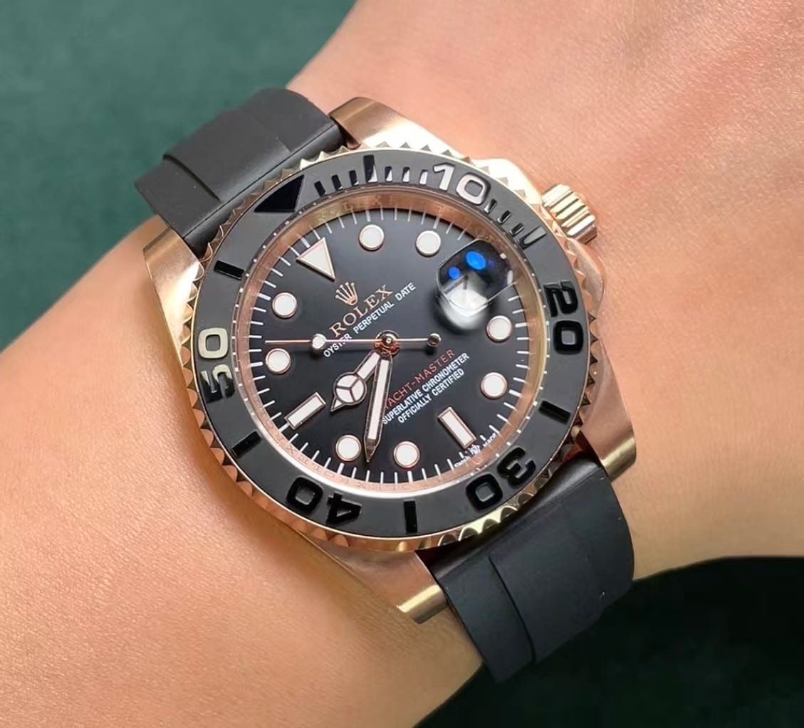The matte black dial features perfectly applied hour markers with genuine-grade Swiss Super-Luminova, offering a balanced glow comparable to the authentic piece. The “YACHT-MASTER” red print is vivid and positioned precisely as per the Rolex original.