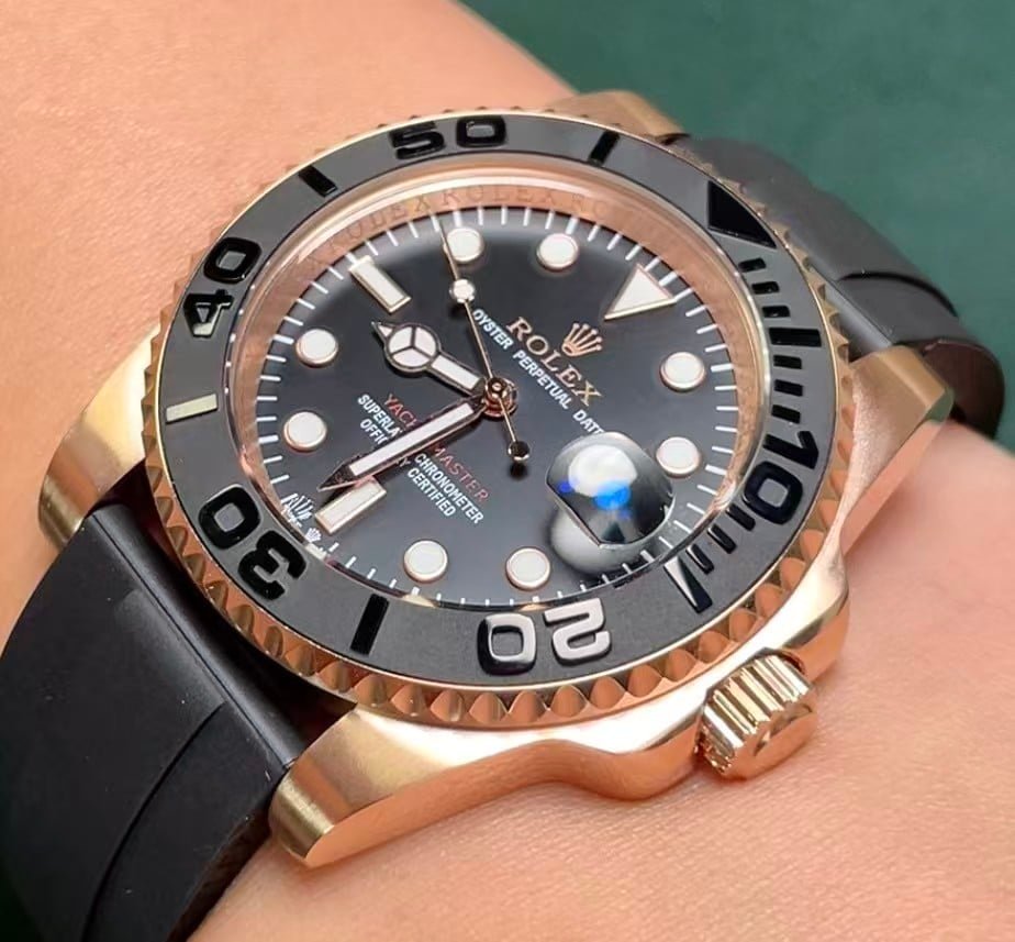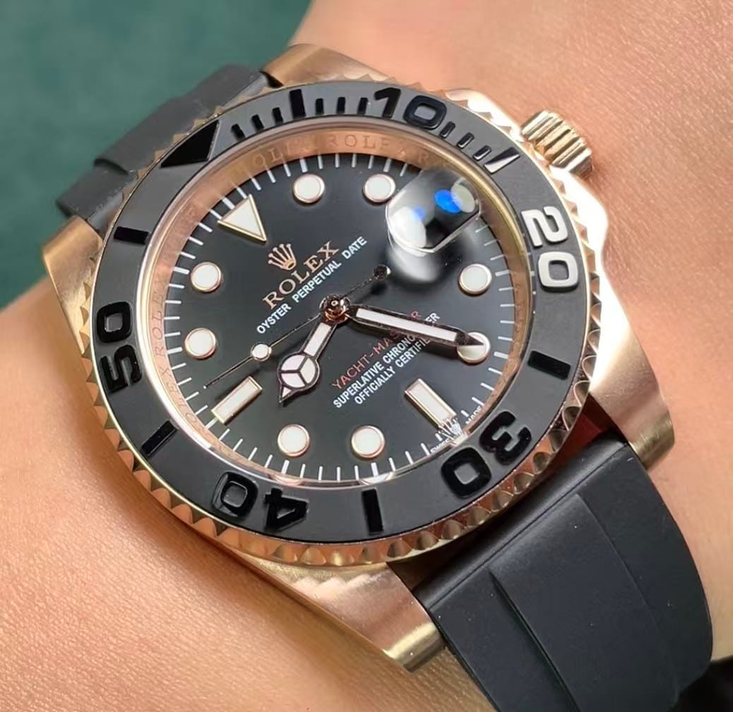 The Rolex Yacht-Master 40 from Clean Factory stands as one of the most accurate 1:1 replicas ever produced in China’s high-end watchmaking scene. This model replicates the Everose Gold edition (Ref. 126655) with striking precision — from its polished and satin-finished lugs to the matte black Cerachrom bezel insert with raised numerals.