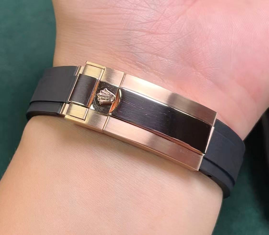This model comes with Clean’s FKM rubber Oysterflex strap, complete with the Everose-plated clasp engraved with Rolex markings. The flexibility and surface texture mimic the real Oysterflex, comfortable enough for all-day wear without skin irritation.