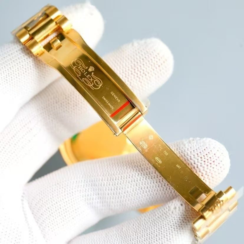 This configuration follows the Rolex Day-Date 40 ref. 228238, using a yellow-gold aesthetic paired with a white Mother-of-Pearl (MOP) dial and slim baguette indexes. Rather than printing color, the dial reflects light through natural layers of nacre—giving softness, iridescence, and unpredictable shimmer.