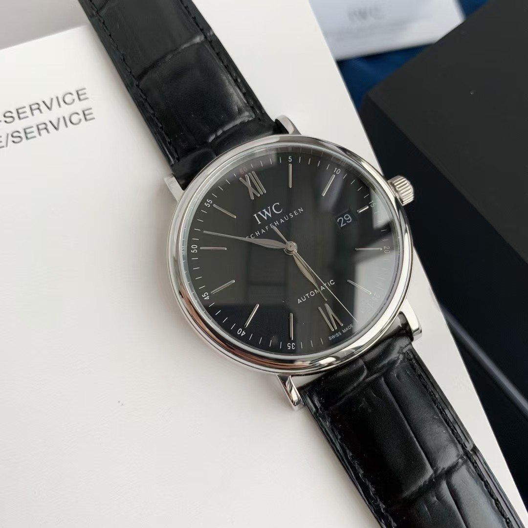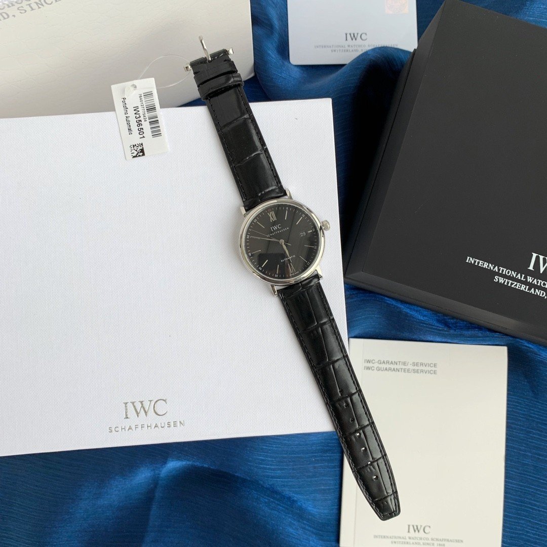 Based on the stainless steel case, black dial configuration, and classic Portofino layout, this watch corresponds to the IWC Portofino Automatic 40, reference IW356502.