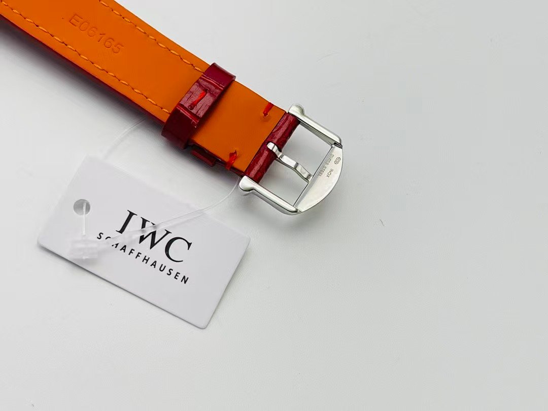 The watch is shown on a red calfskin leather strap (aftermarket styling choice), with light padding and clean stitching. While not original to IWC, the strap demonstrates how adaptable the watch is to different tones without losing balance.