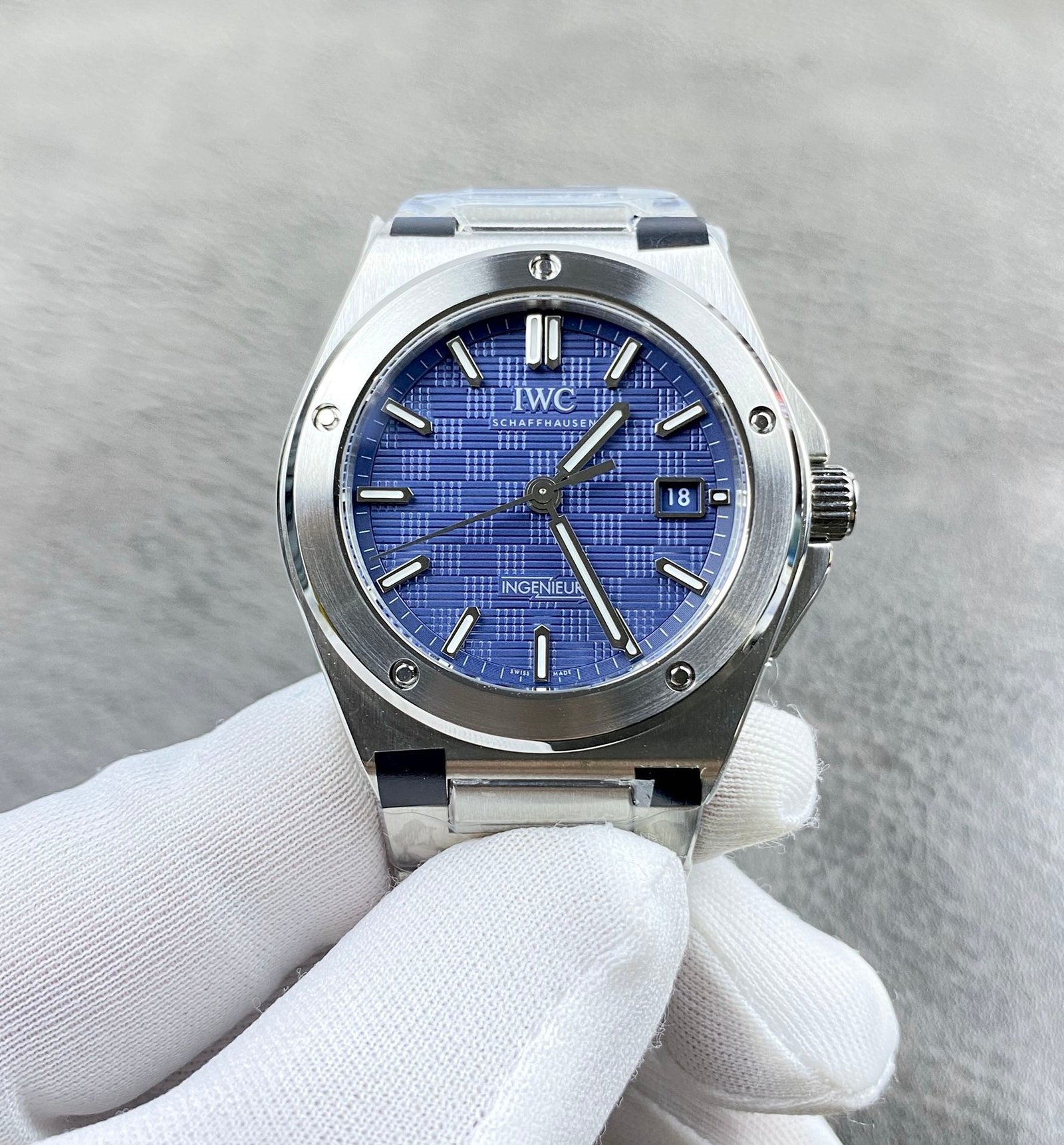 The blue grid dial shown here corresponds directly to the current-generation Ingenieur design introduced by IWC, with no legacy elements mixed in.