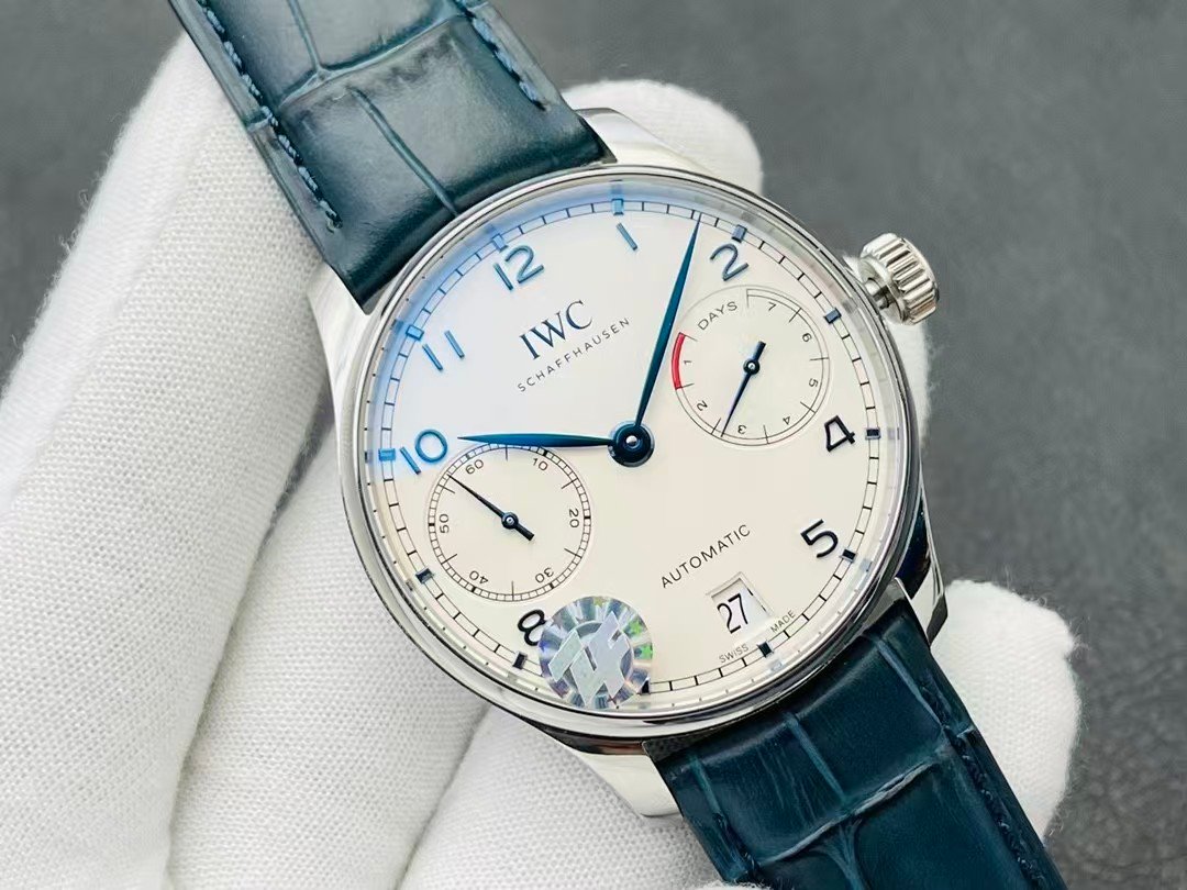 This watch is the IWC Portugieser Automatic 7 Days IW500705, known among collectors as the “Grape Seven” due to its classic Portugieser lineage rather than any marketing flourish. The piece shown here is the white dial, blue hands configuration, produced by ZF Factory V5, and it remains one of the few super clone replicas whose credibility improves with time instead of fading.