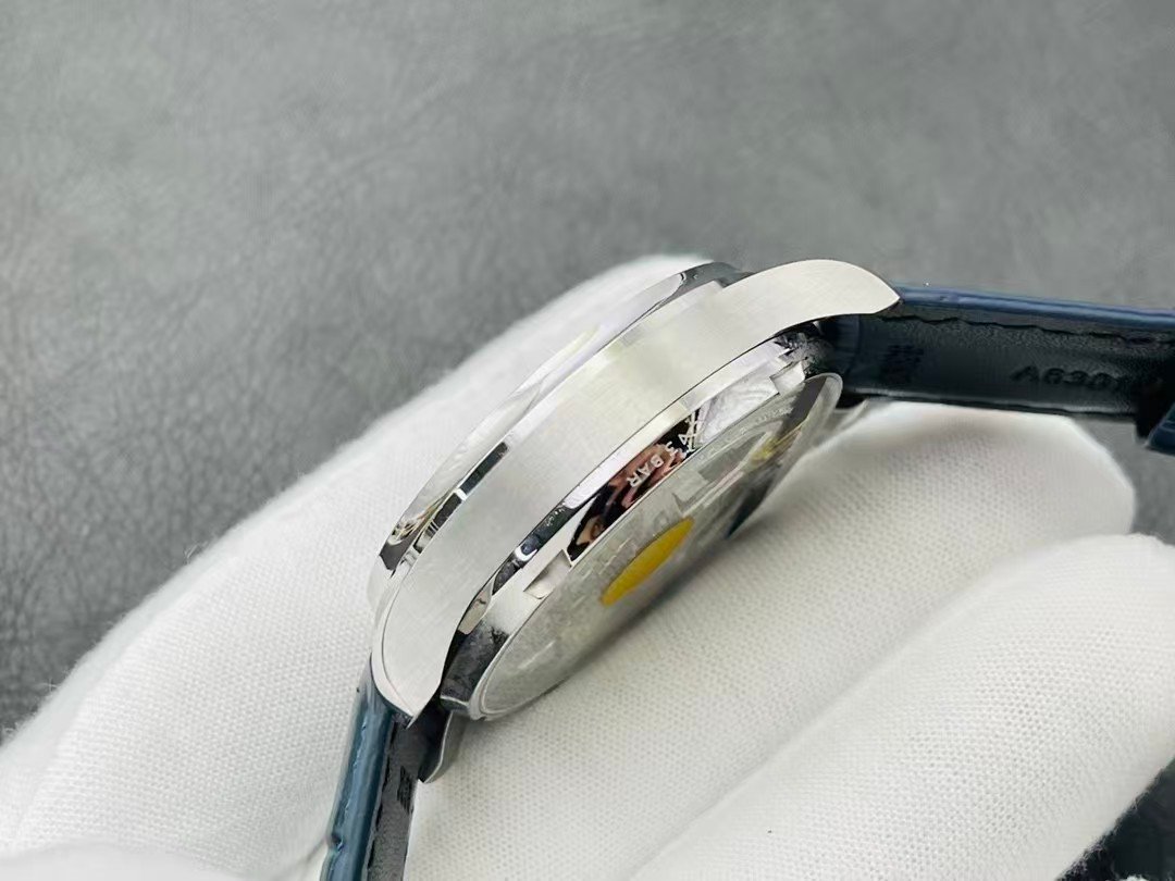 Applied Arabic numerals are evenly spaced and proportioned, avoiding the common replica issue of oversized or misaligned digits. The leaf-shaped blued hands are correctly curved, with accurate length and taper. Their motion feels calm and deliberate rather than exaggerated.