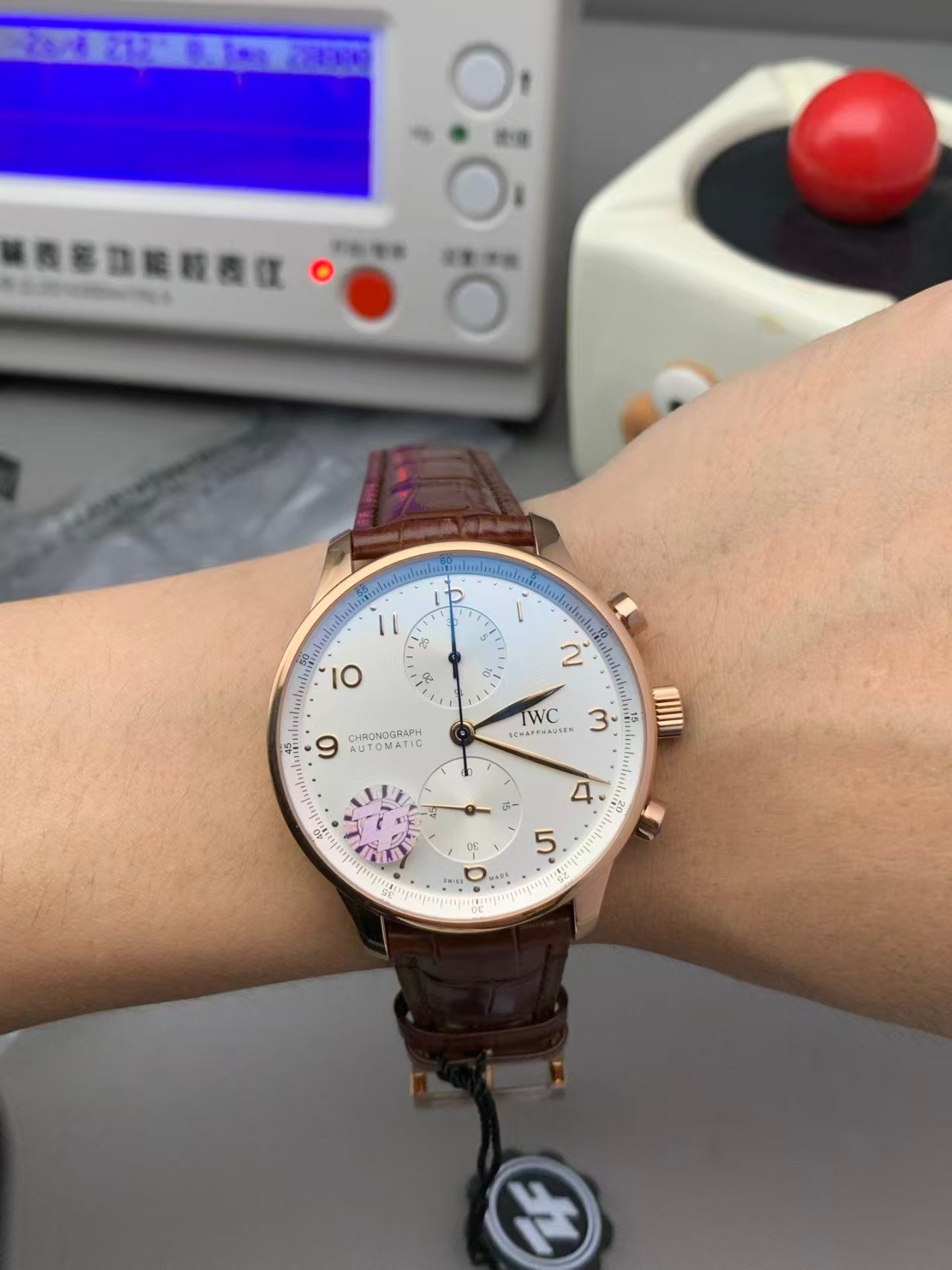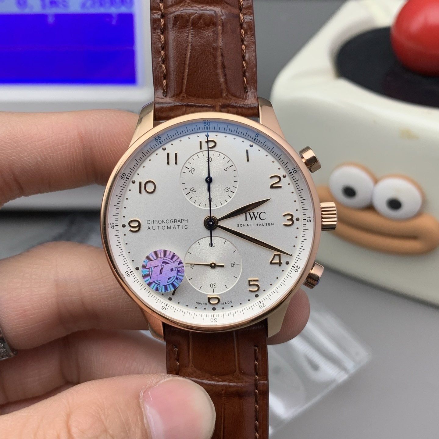 The case measures 41 mm in diameter with a thickness of approximately 13 mm, closely aligned with the genuine IW3716. This is a crucial improvement over older Portugieser chronograph replicas that ran oversized or excessively thick.