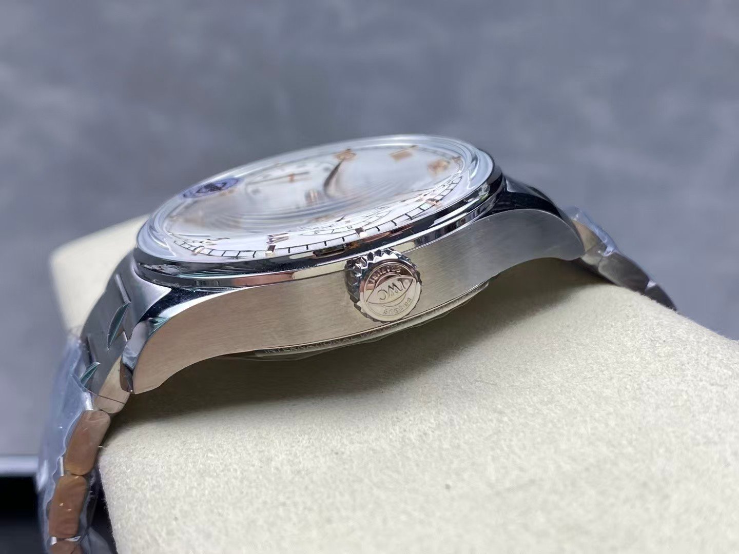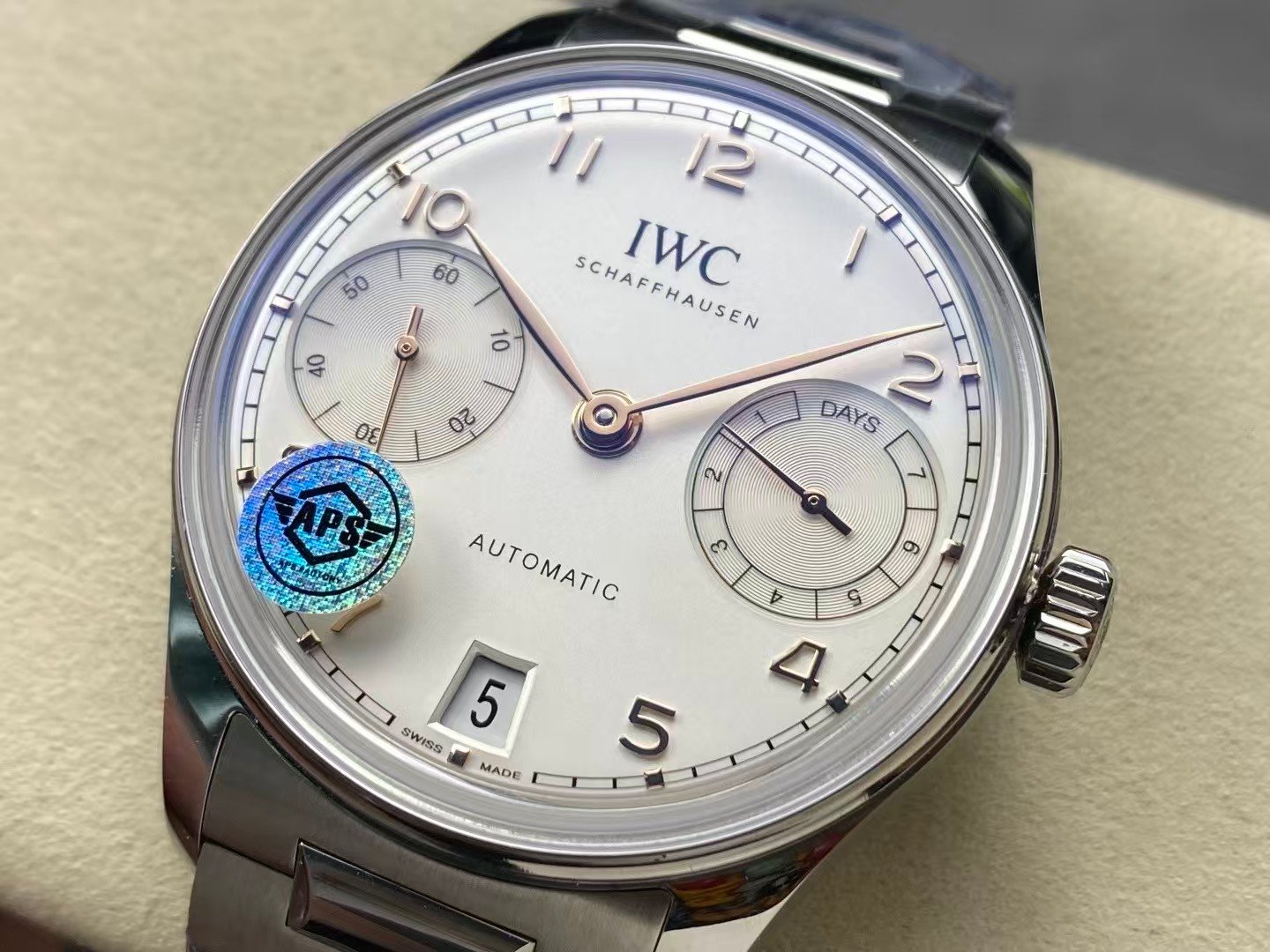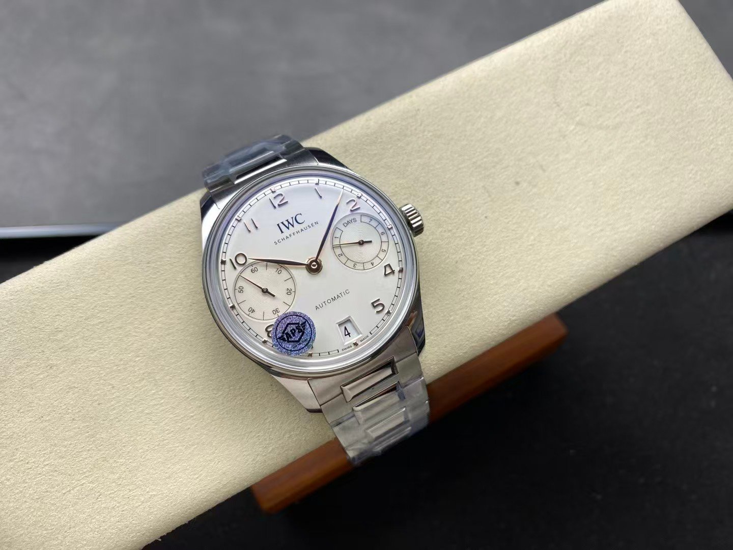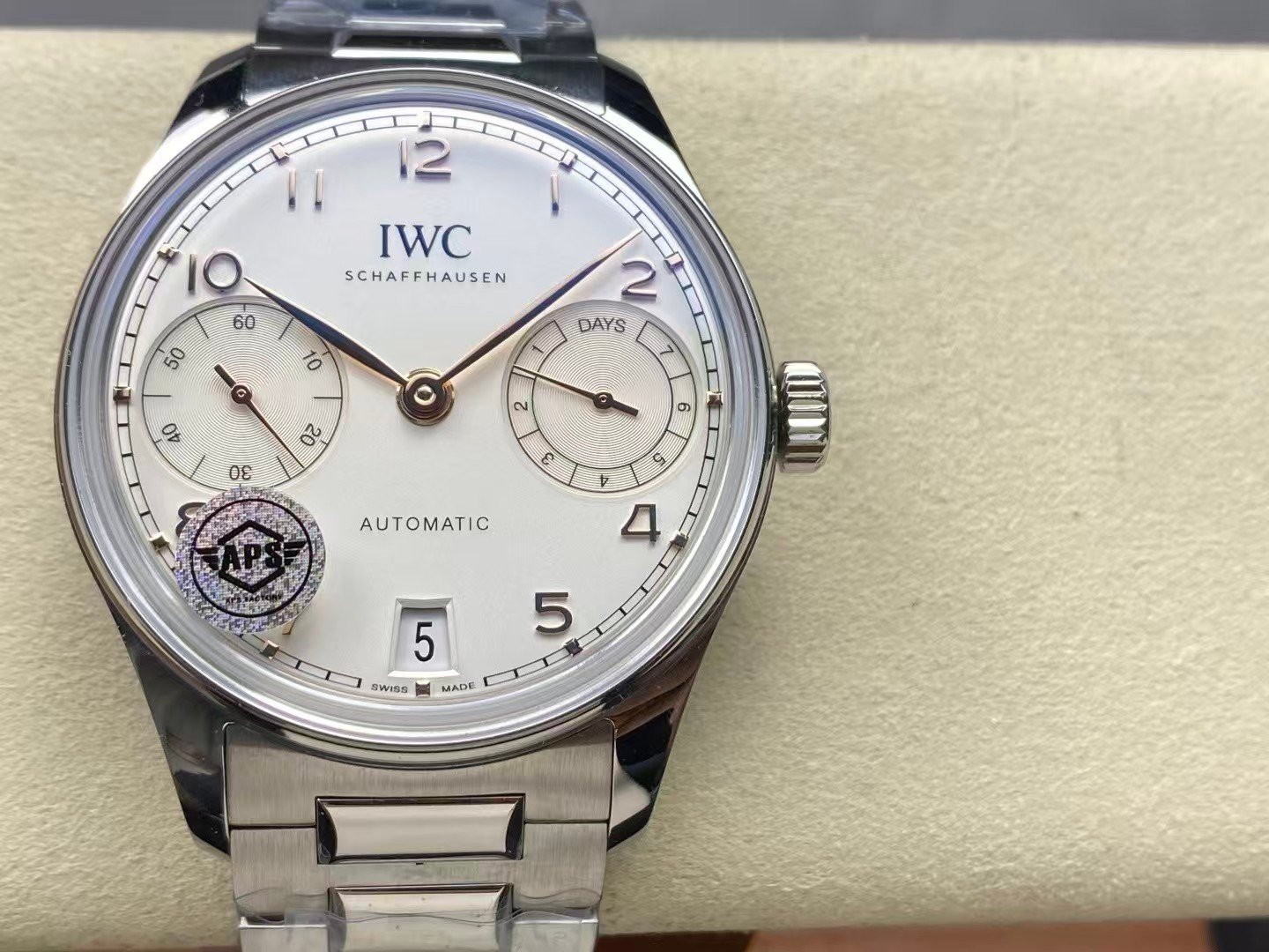 The genuine IWC Portuguese 7 Days measures approximately 42.3mm in diameter with a balanced thickness just under 14mm. APS follows these proportions closely, preserving the open, elegant stance that defines the Portuguese line.