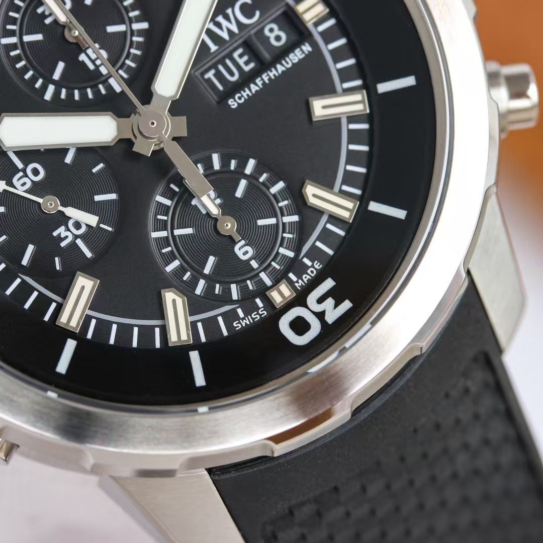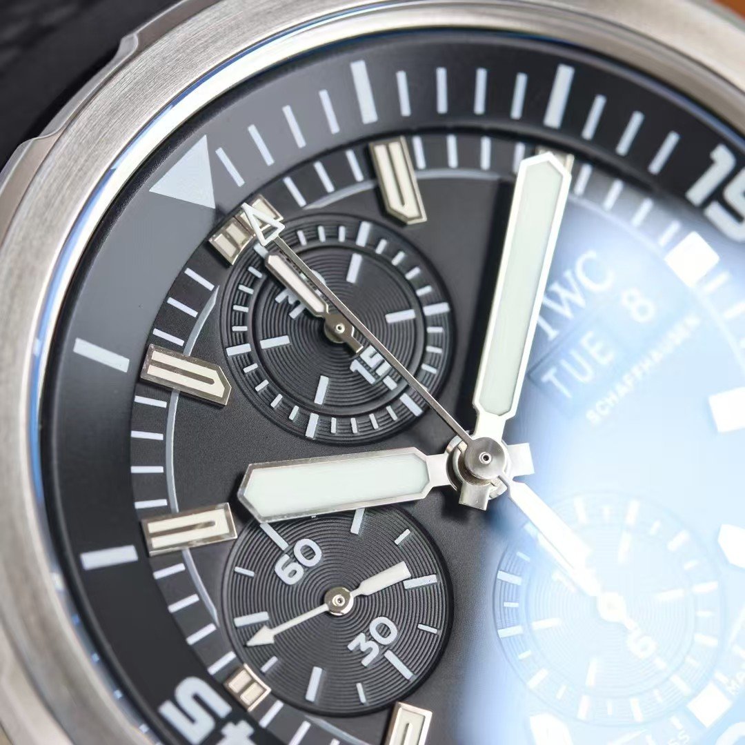 Under artificial light, this dial behaves like the genuine Aquatimer: legible, calm, and functional. There is no exaggerated gloss or over-bright printing that draws attention.