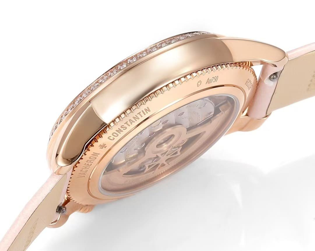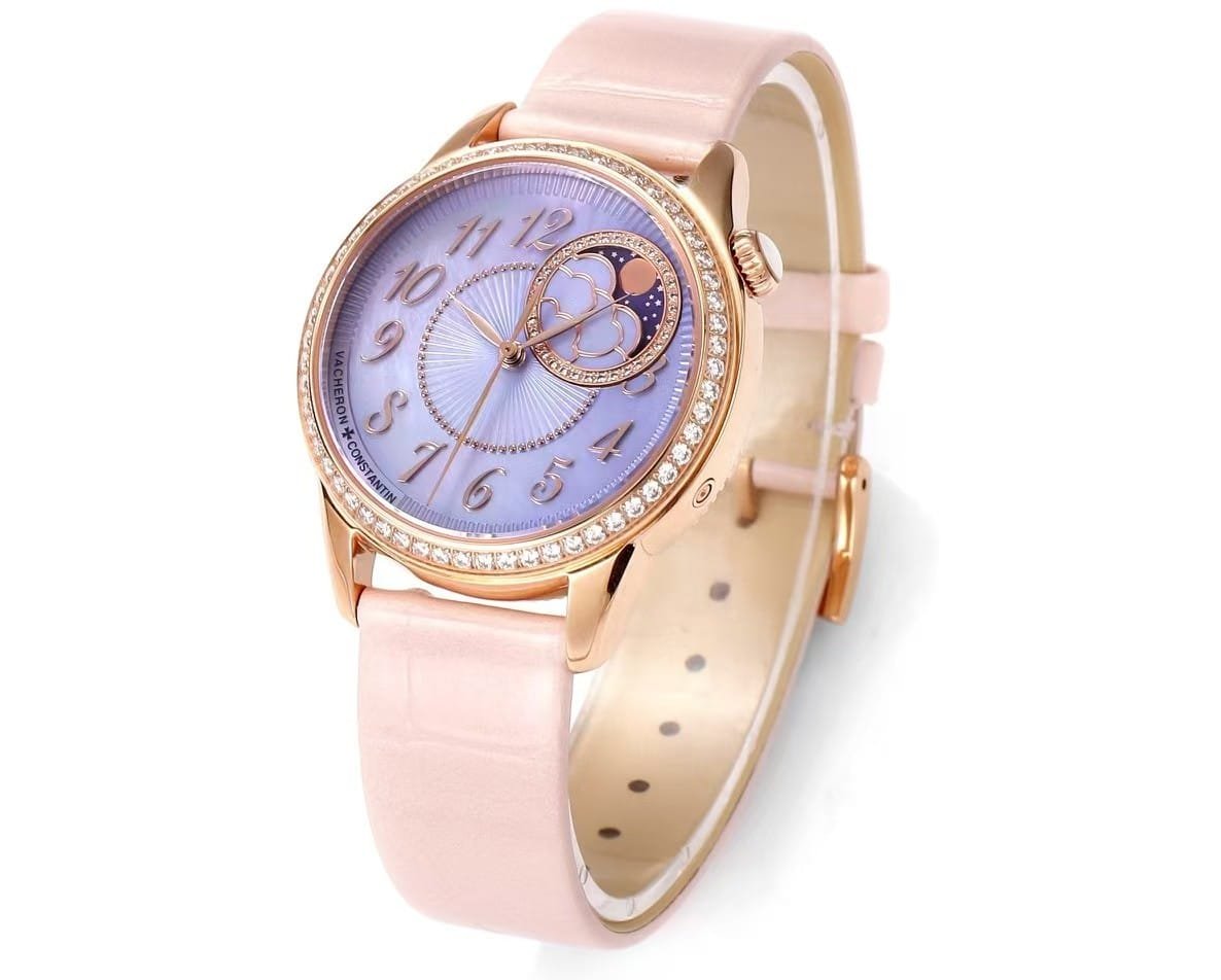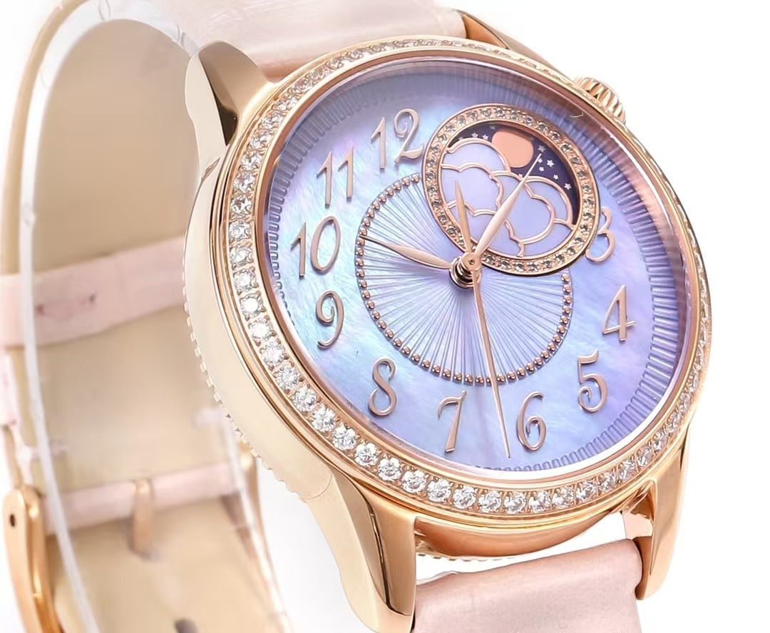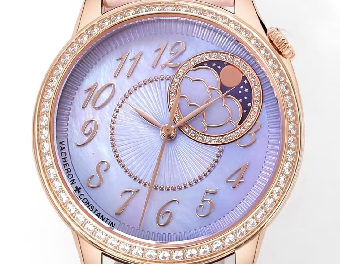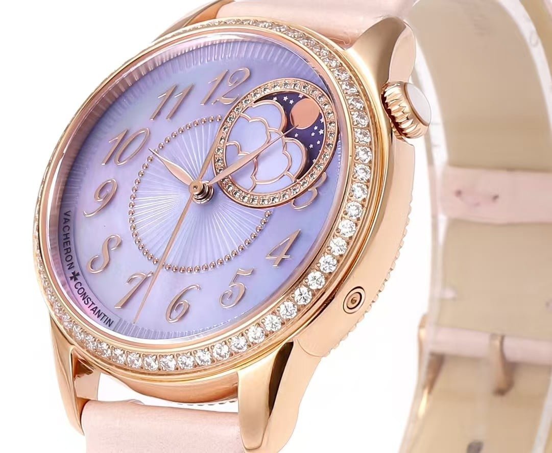 This KB factory Super Clone is modeled after the Vacheron Constantin Égérie Moon Phase reference 8005F/000R-B958, here presented in the Lilac Mother-of-Pearl dial with rose gold case configuration. This colorway is one of the softest and most luminous interpretations within the Égérie line, shifting between pale lavender, soft pink, and iridescent white depending on lighting.