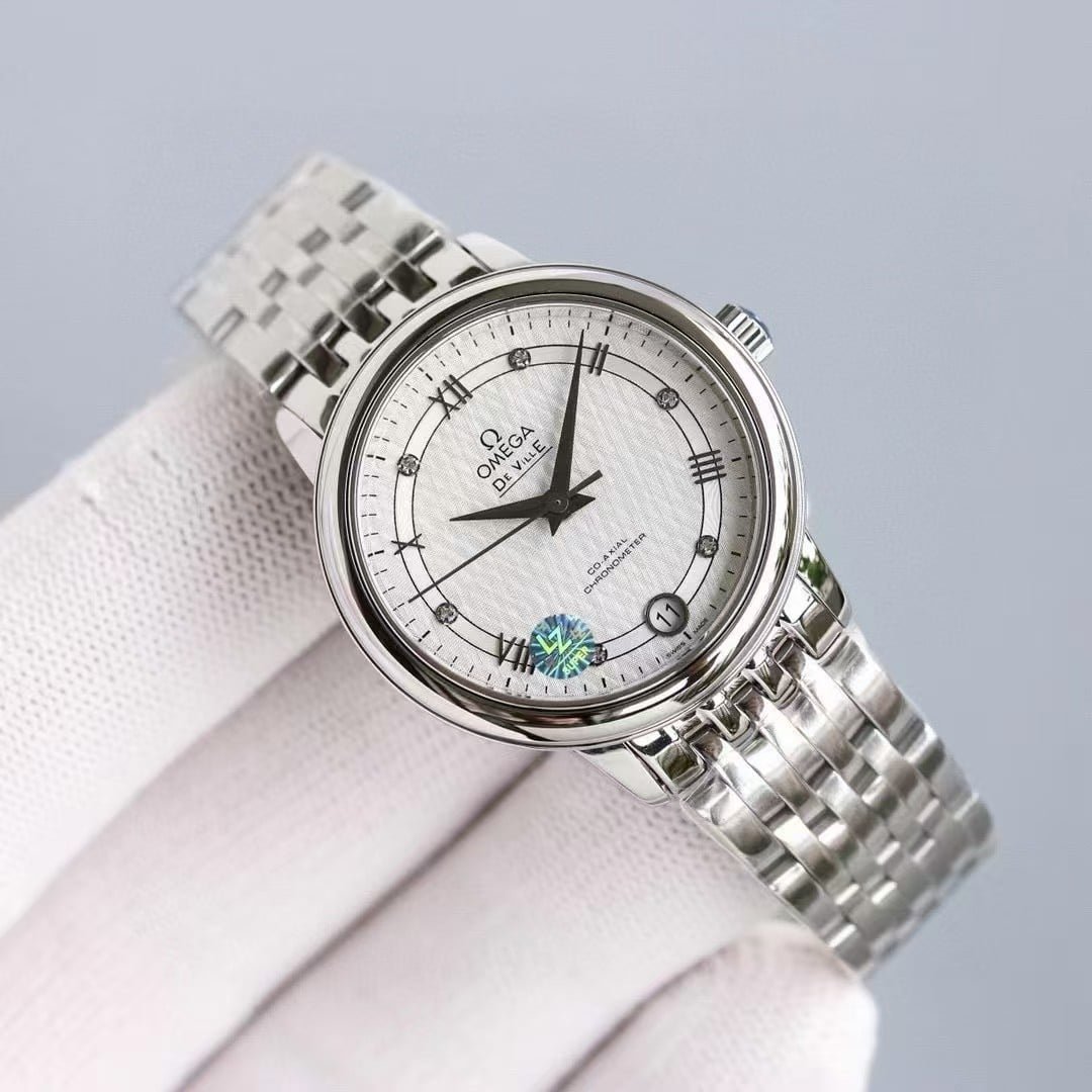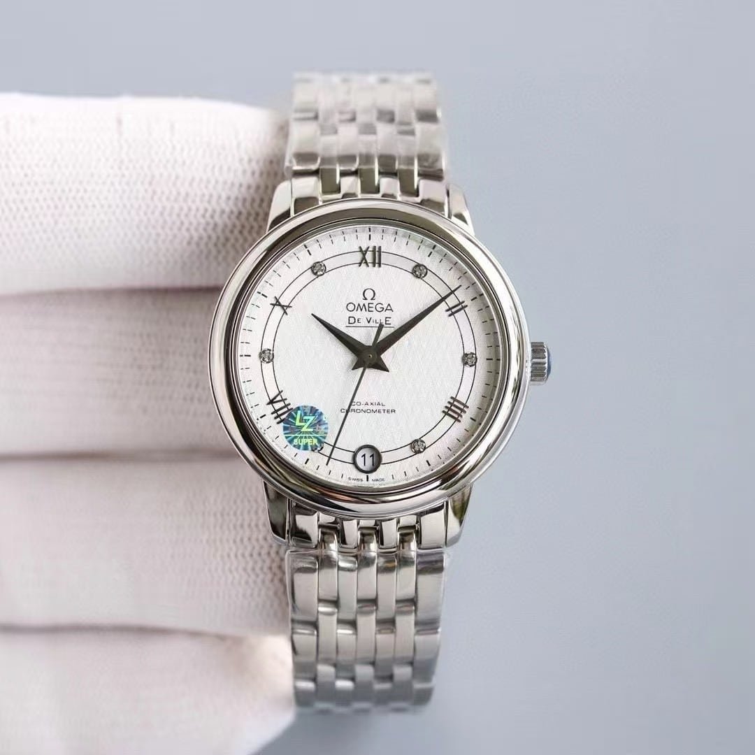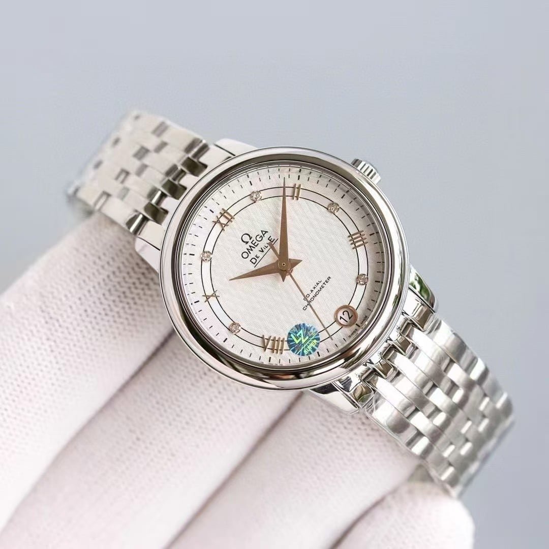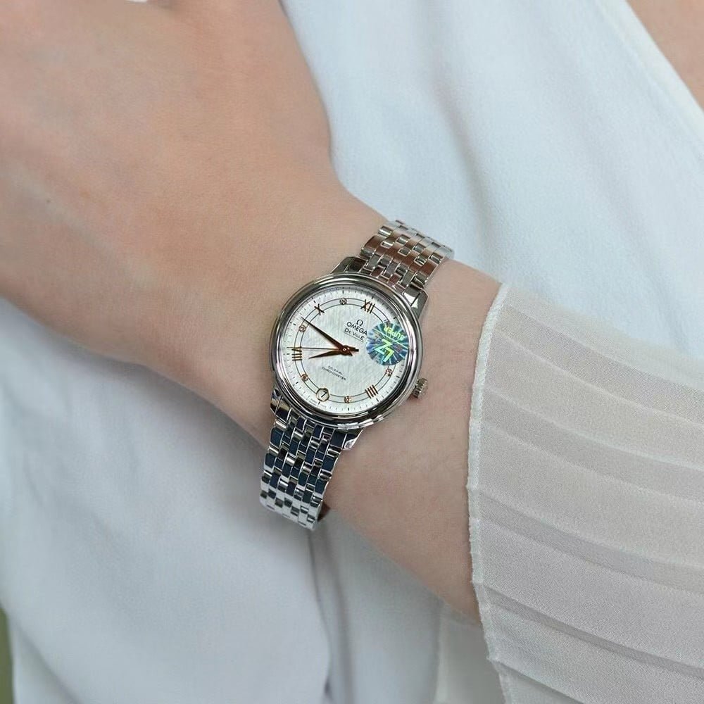 The watch captures the timeless grace of Omega’s De Ville series: a polished 316L stainless-steel case, a multi-link bracelet with fluid wrist ergonomics, and a silver vertical-grain dial adorned with diamond hour markers and elegant Roman numerals. Each detail is executed with precision — the chamfered hands shimmer subtly, the date window at 6 o’clock aligns flawlessly, and the printing quality rivals far costlier clones.
