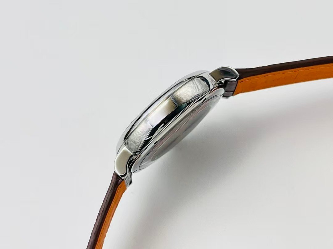 The watch is paired with a brown calfskin leather strap, lightly padded with clean stitching. The strap complements the mother-of-pearl dial without drawing focus away from it.