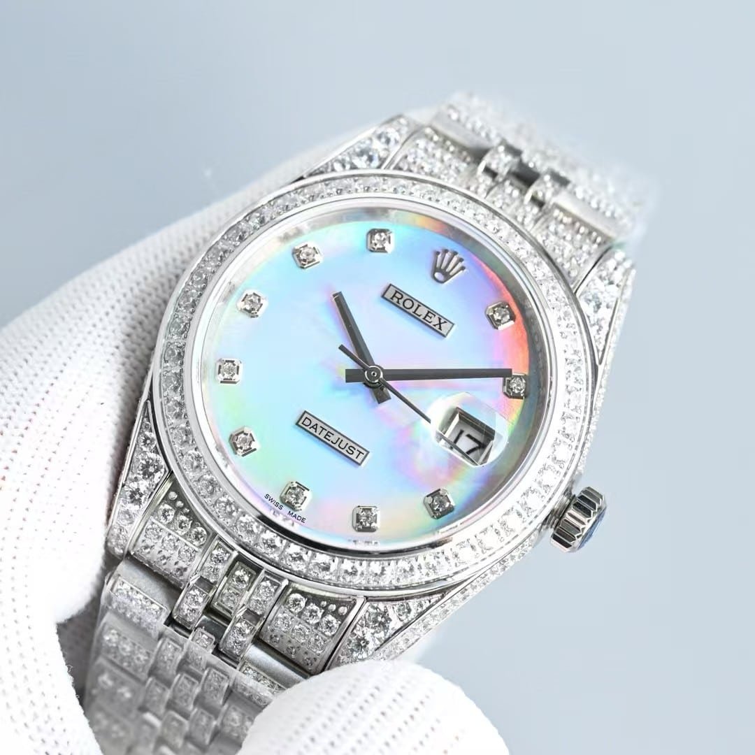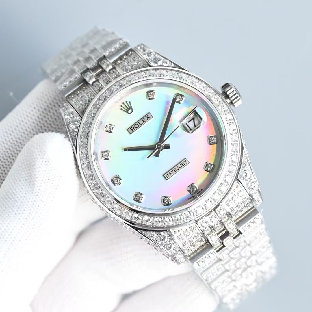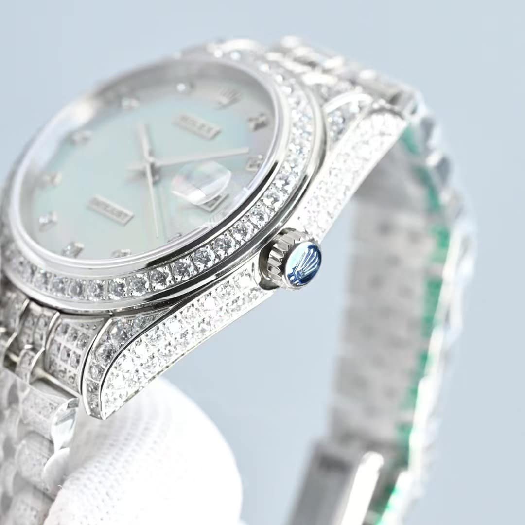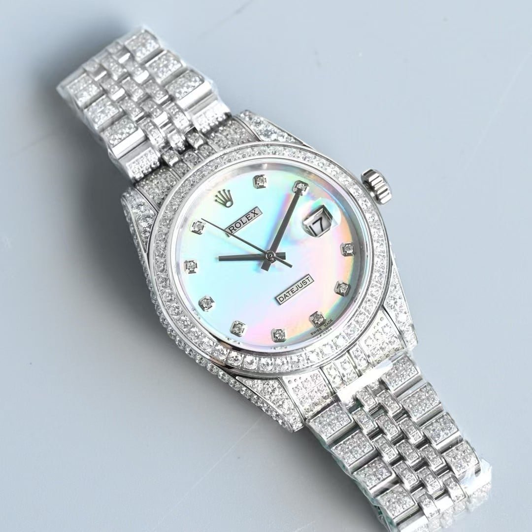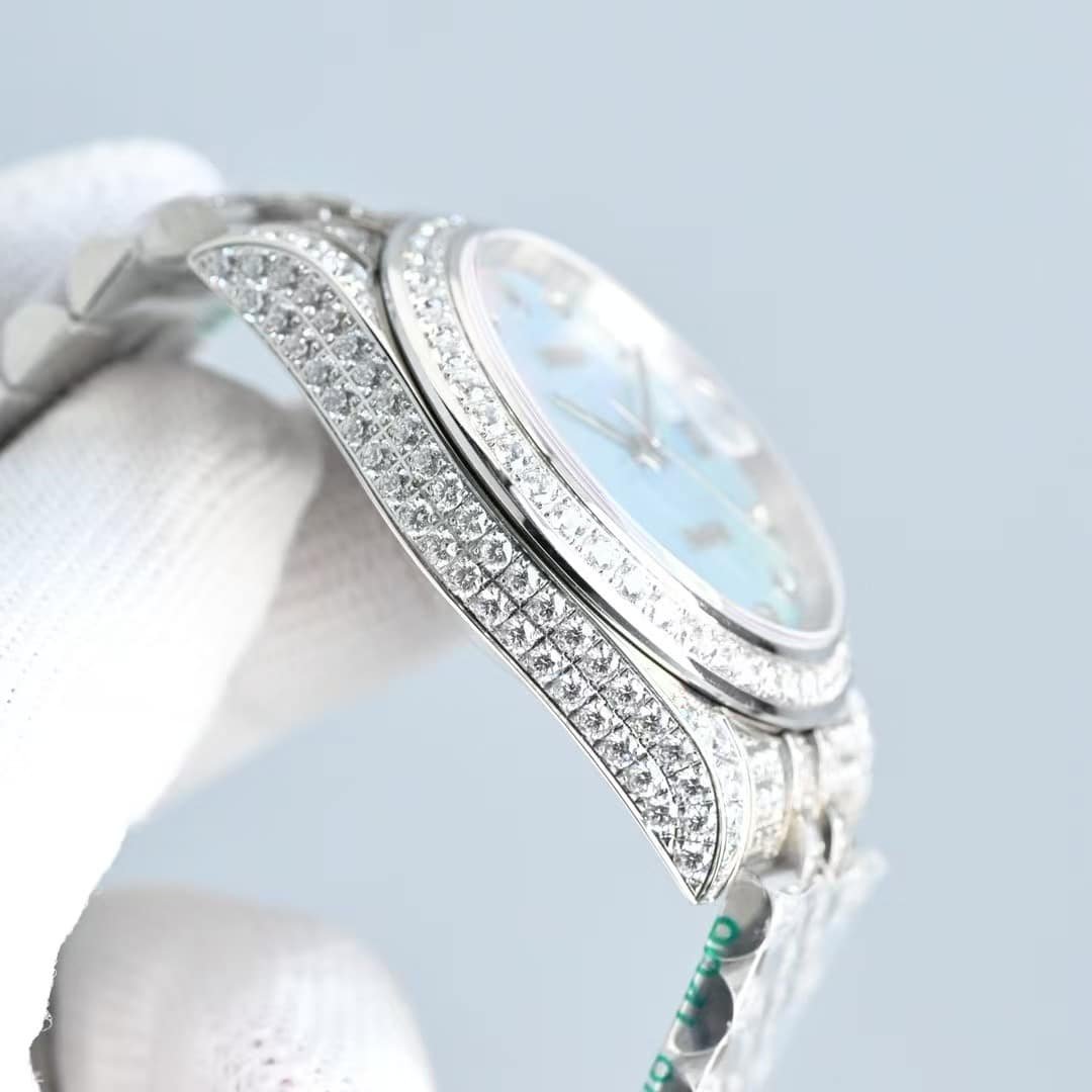 What makes this configuration appealing to many collectors is the contrast between softness and structure. The dial gives off a gentle, shifting glow, while the stones on the case and bracelet bring sharp geometry. Together they create a look that’s bright without being aggressive, luxurious without becoming visually heavy. It’s a super clone watch built for people who want elegance with presence—something that stands apart in its own quiet way.