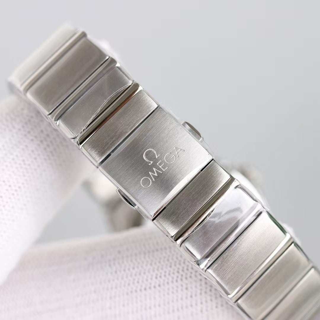 The hands and Omega logo are rhodium-plated for anti-oxidation durability, while the engraved Constellation script and star emblem at 6 o’clock maintain perfect alignment with the dial axis, mirroring Omega’s genuine production standard.