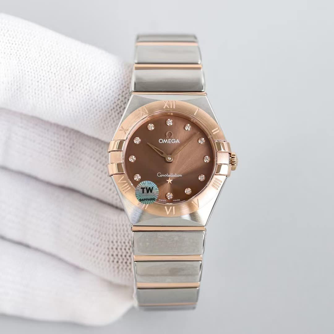This TW Factory Omega Constellation is a premium 1:1 super clone watch that combines authentic design precision with top-tier craftsmanship. The model features a 29mm stainless steel and rose gold case, beautifully matched with a sunburst chocolate brown dial adorned with diamond hour markers, echoing the elegance of Omega’s timeless Constellation collection.