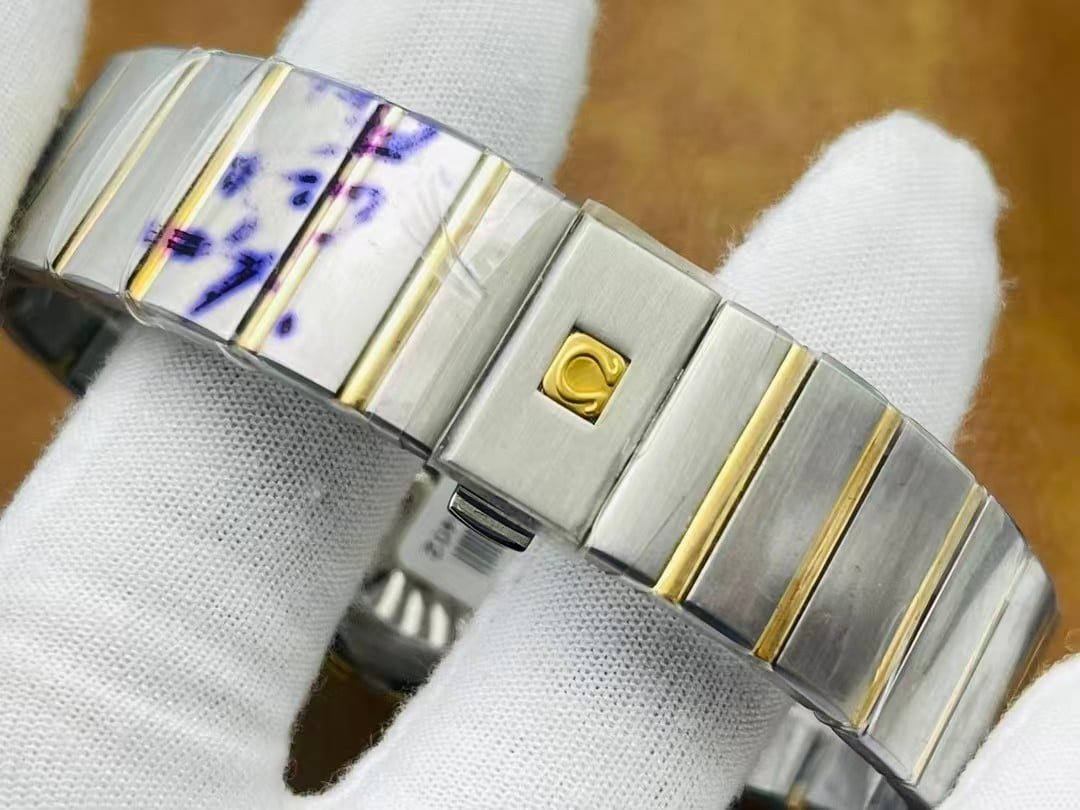 Even the bracelet integration — often where replicas fail — achieves genuine curvature and tension. The brushed links transition smoothly into polished gold accents, offering the same ergonomic fit found in the authentic Omega bracelet.
