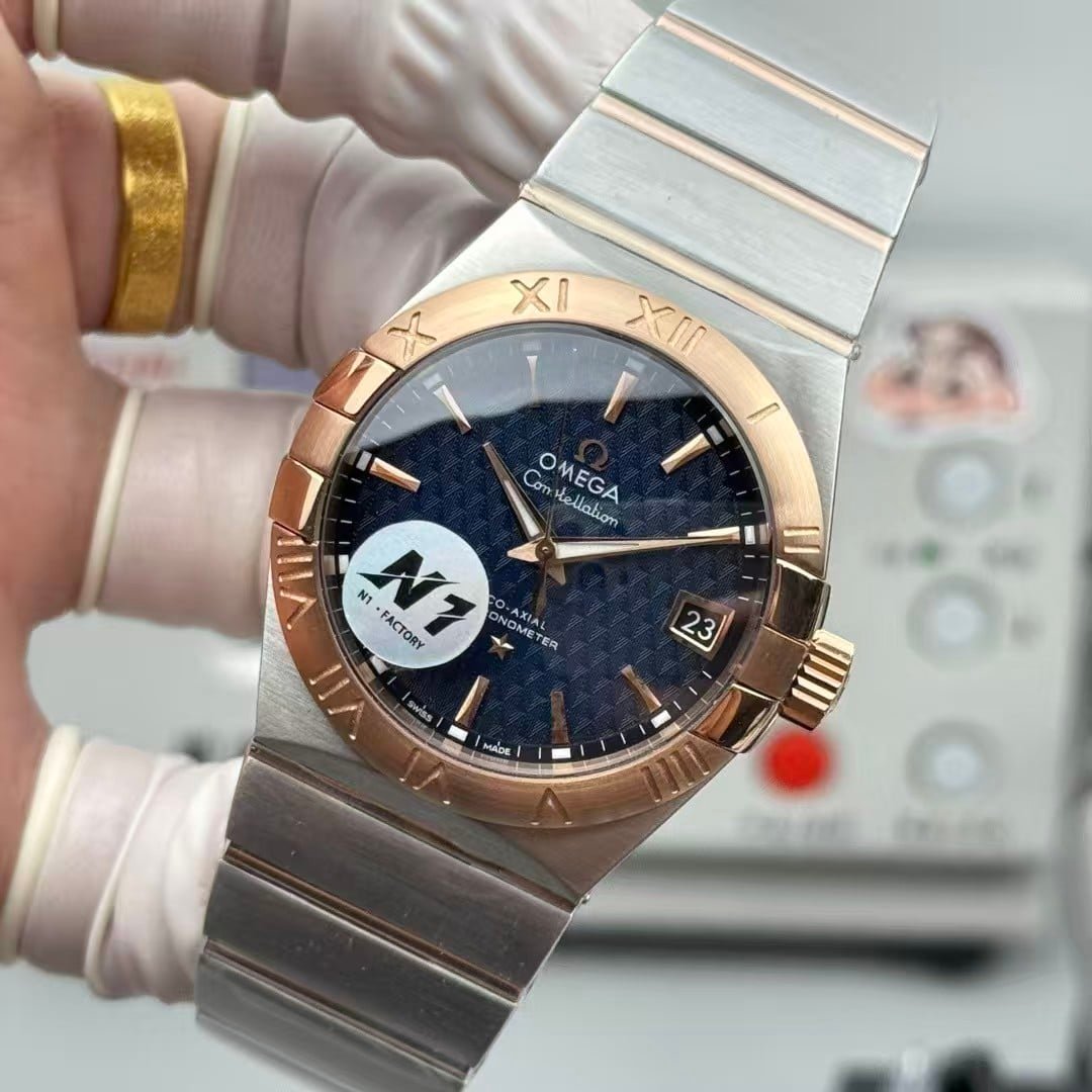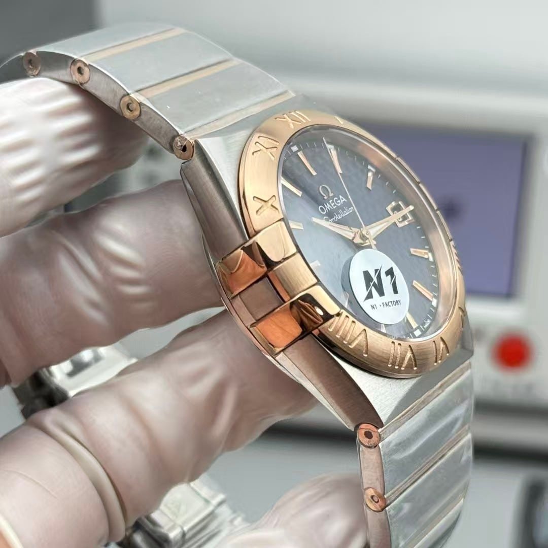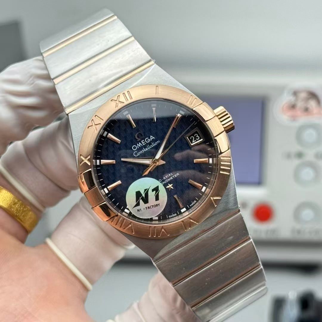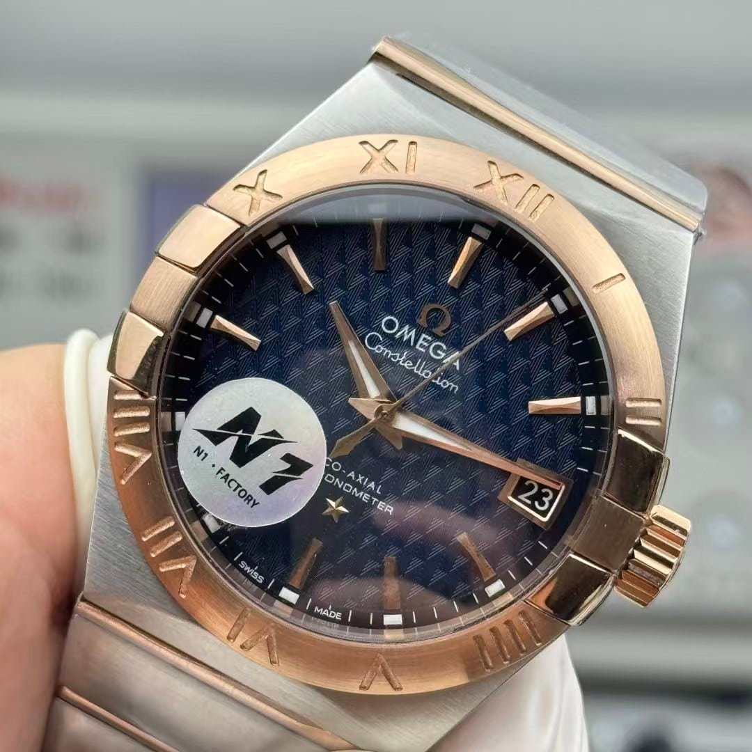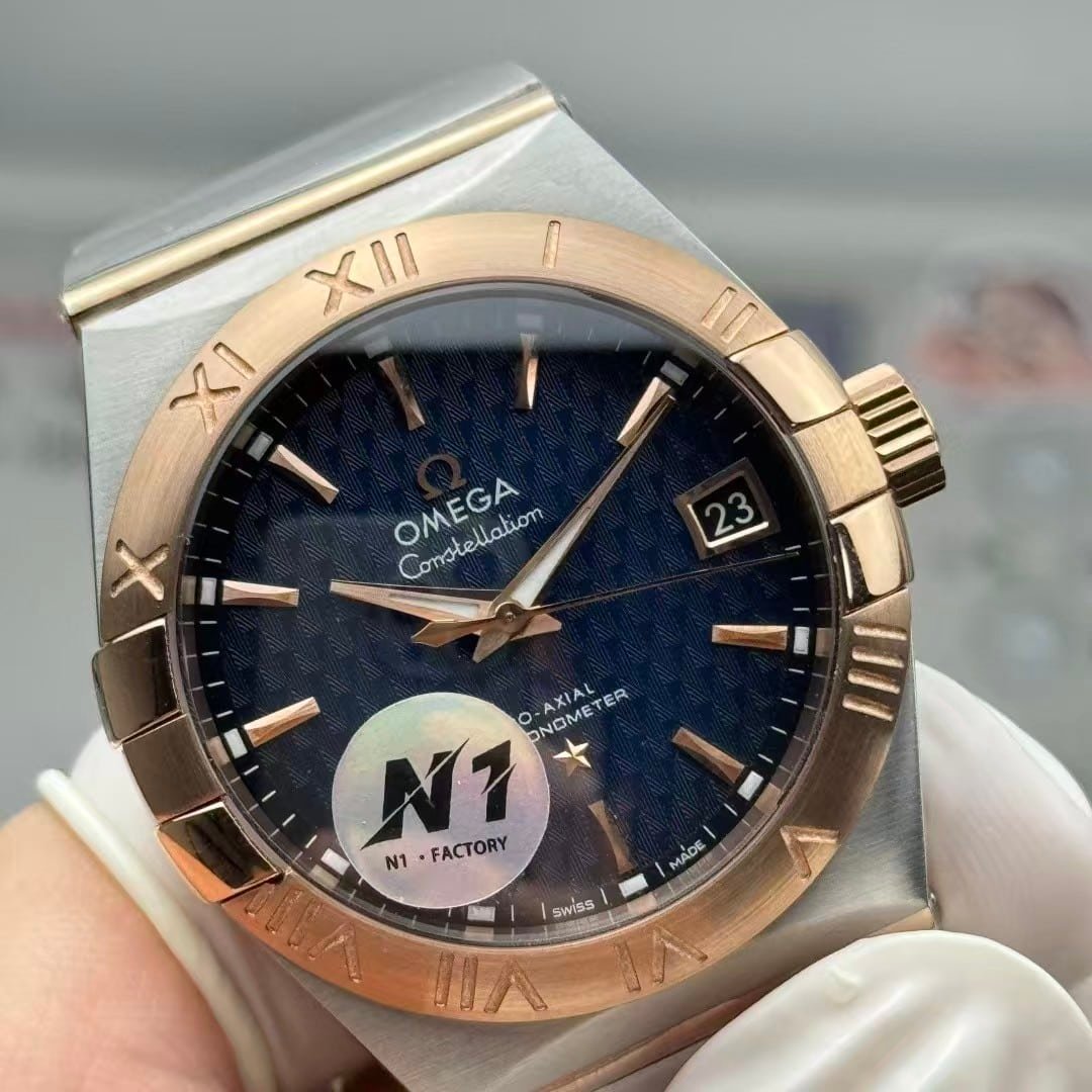 The N1 Factory Omega Constellation Blue Textured Dial is a tribute to the heritage of Swiss horology — a 1:1 super clone that combines luxury design, engineering precision, and collector-level detailing. With its deep navy patterned dial and 18K rose-gold plated bezel, this model captures the refined character of the genuine Omega Constellation Master Chronometer while offering exceptional value and craftsmanship.