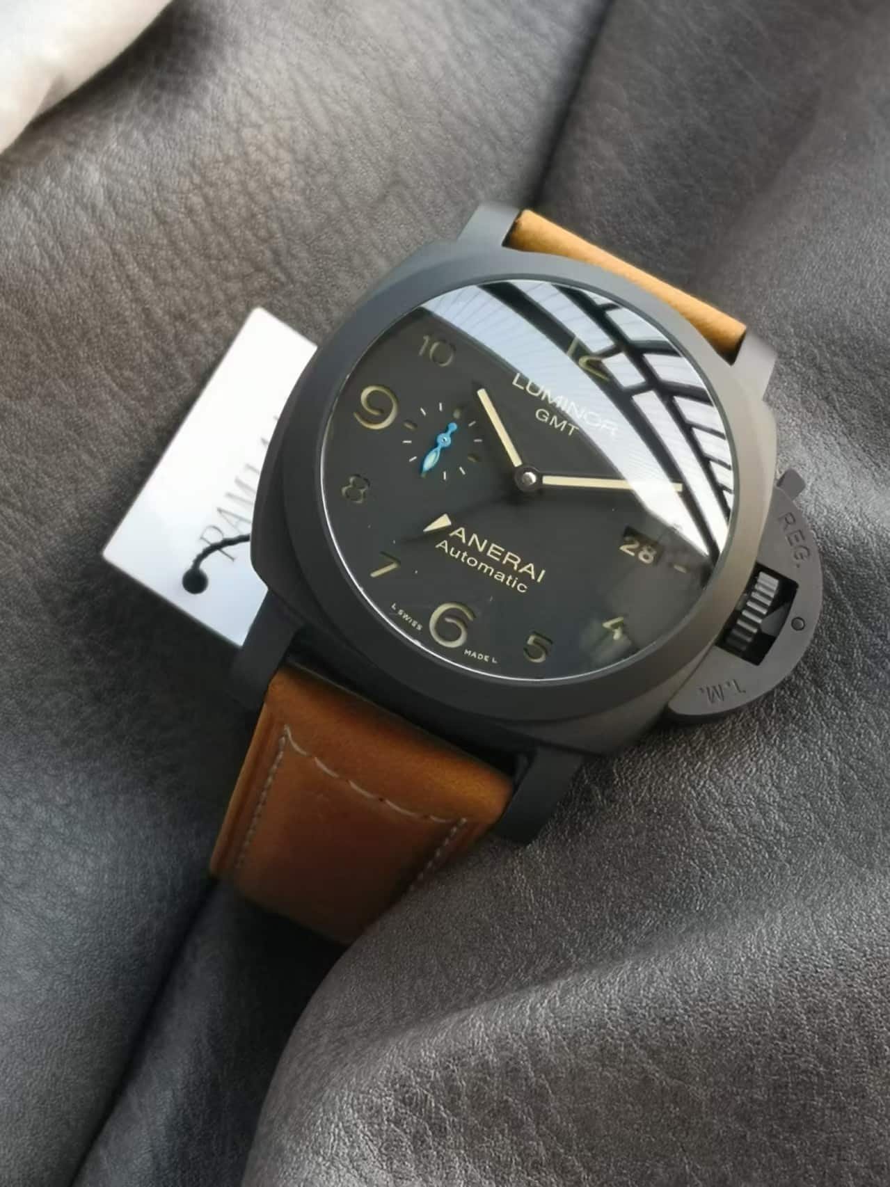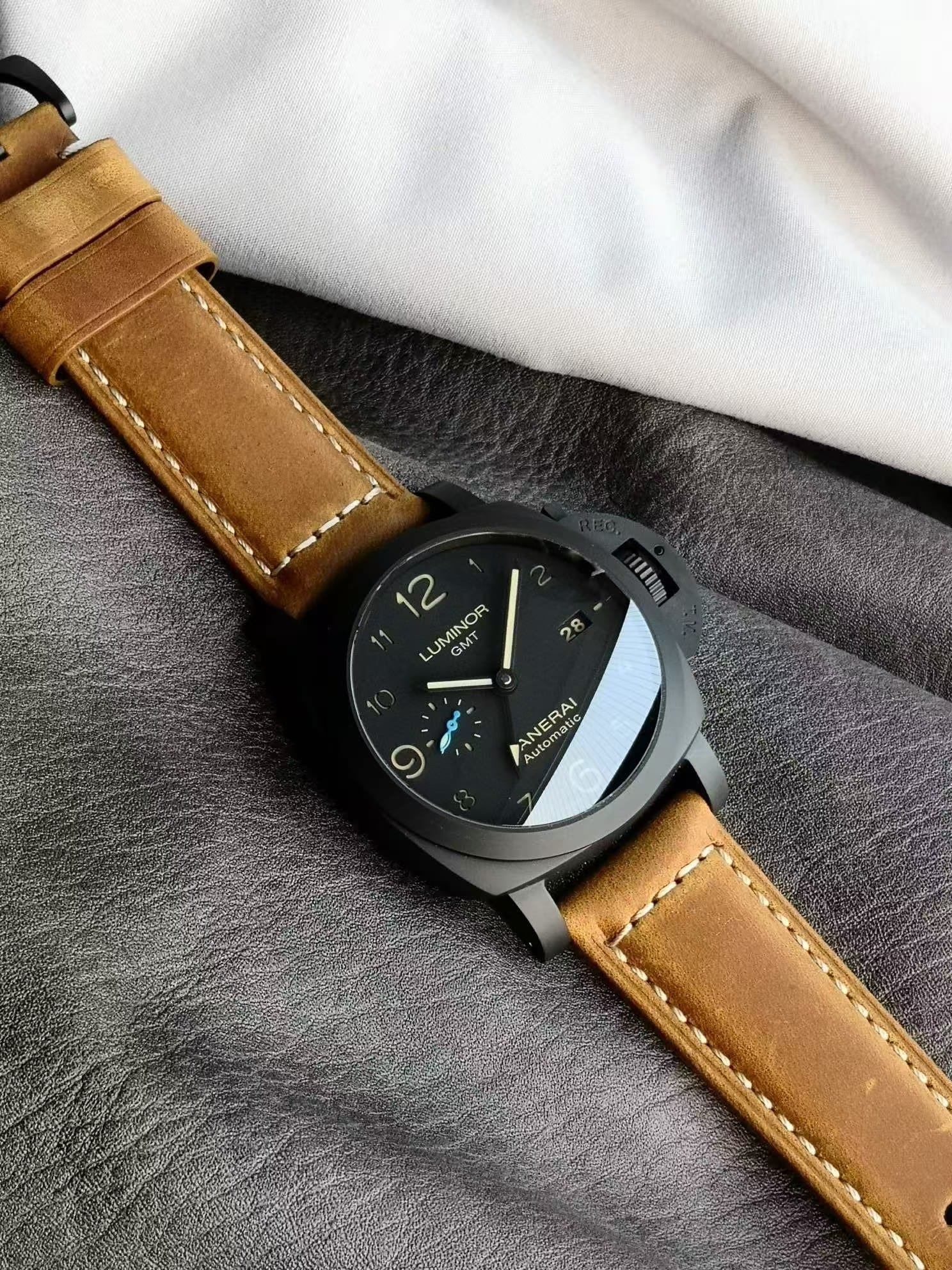 The Panerai Luminor GMT PAM00441 by VS Factory (VSF) is a modern classic — bold, stealthy, and meticulously engineered. This model captures the essence of Panerai’s military-inspired heritage while offering a luxurious interpretation in matte black ceramic and vintage beige lume. It’s one of the most popular and technically refined VSF releases, featuring a fully functional P.9001 clone movement with dual time zone (GMT) and power reserve display.
