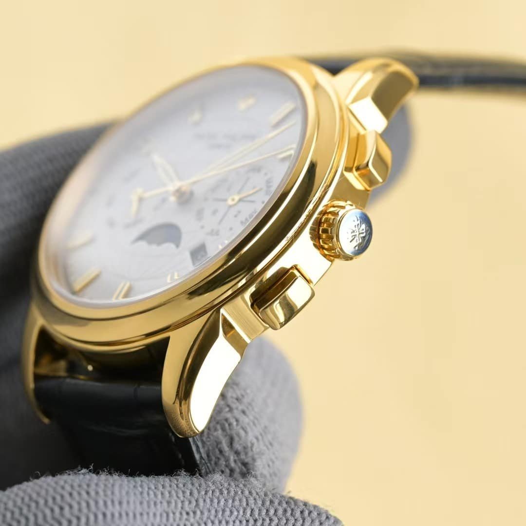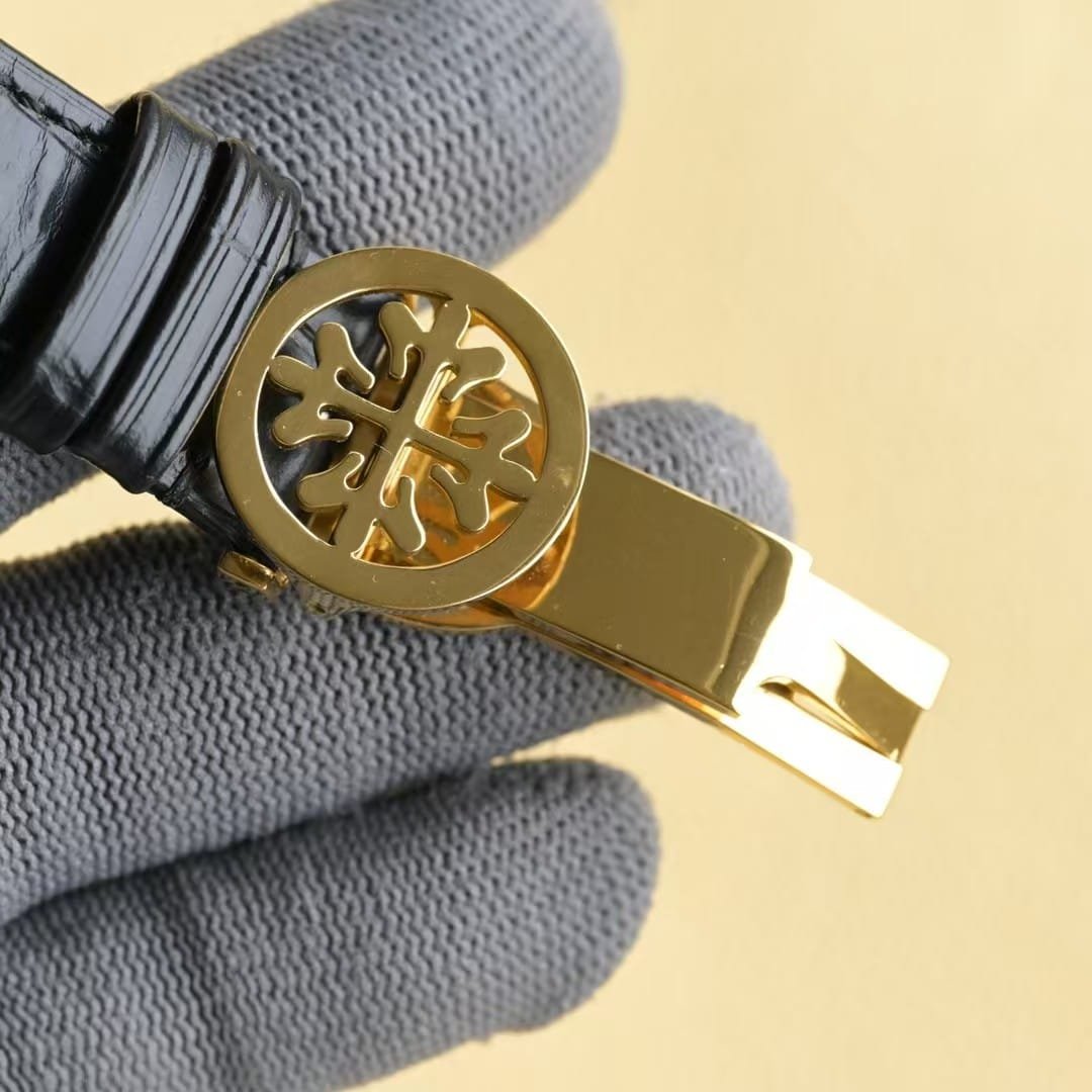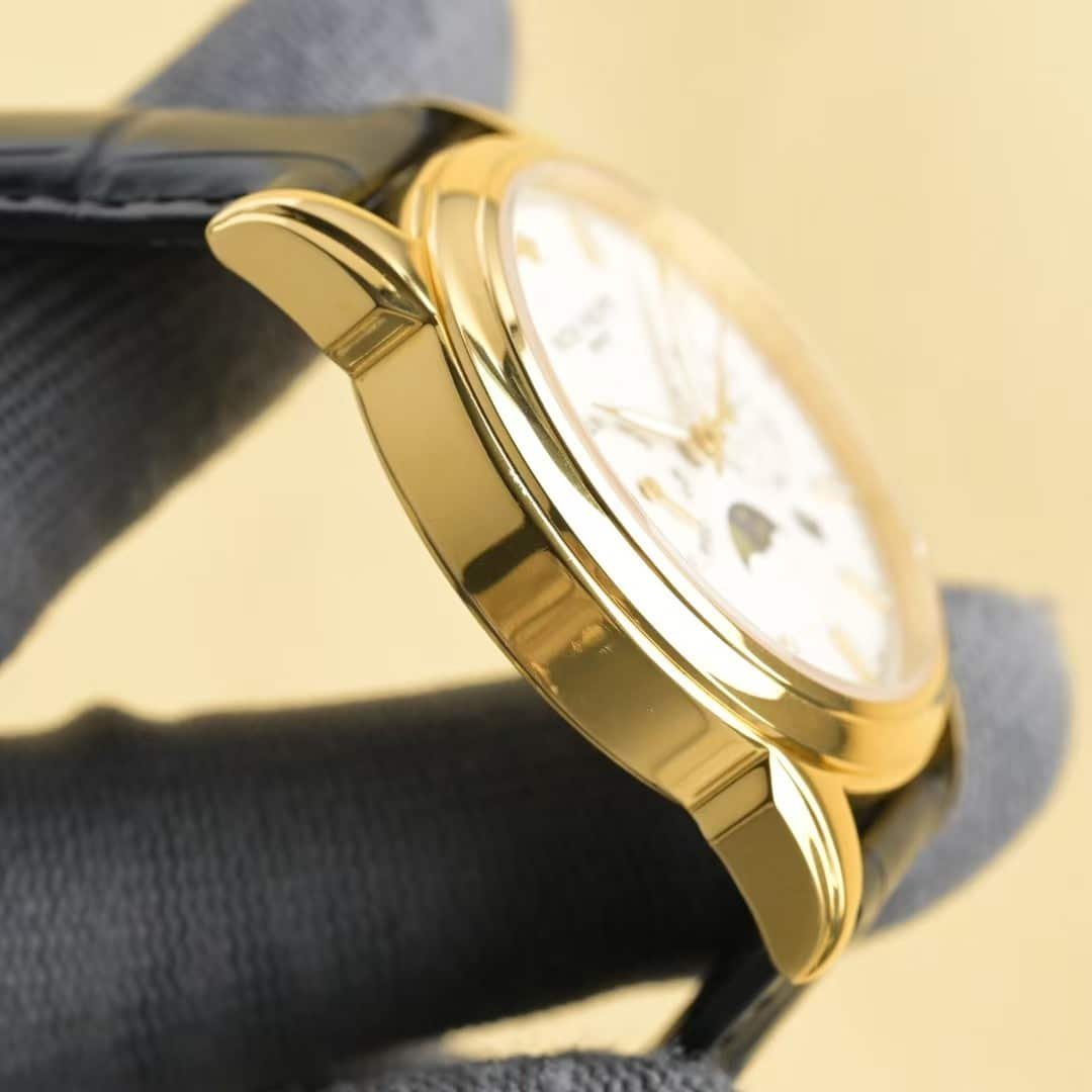 PPF’s gold plating tone mirrors the honey-yellow hue of genuine 18K gold, rather than the dull brass tone common in generic imitations. The dial’s depth and clarity — with crisp calendar windows and sharp printing — are indistinguishable from the authentic reference at a glance.