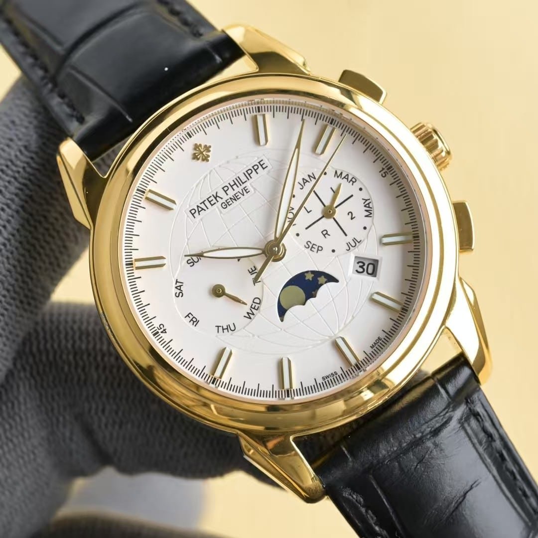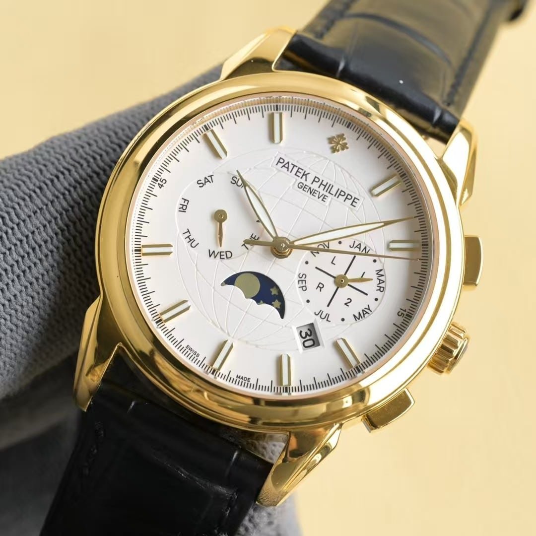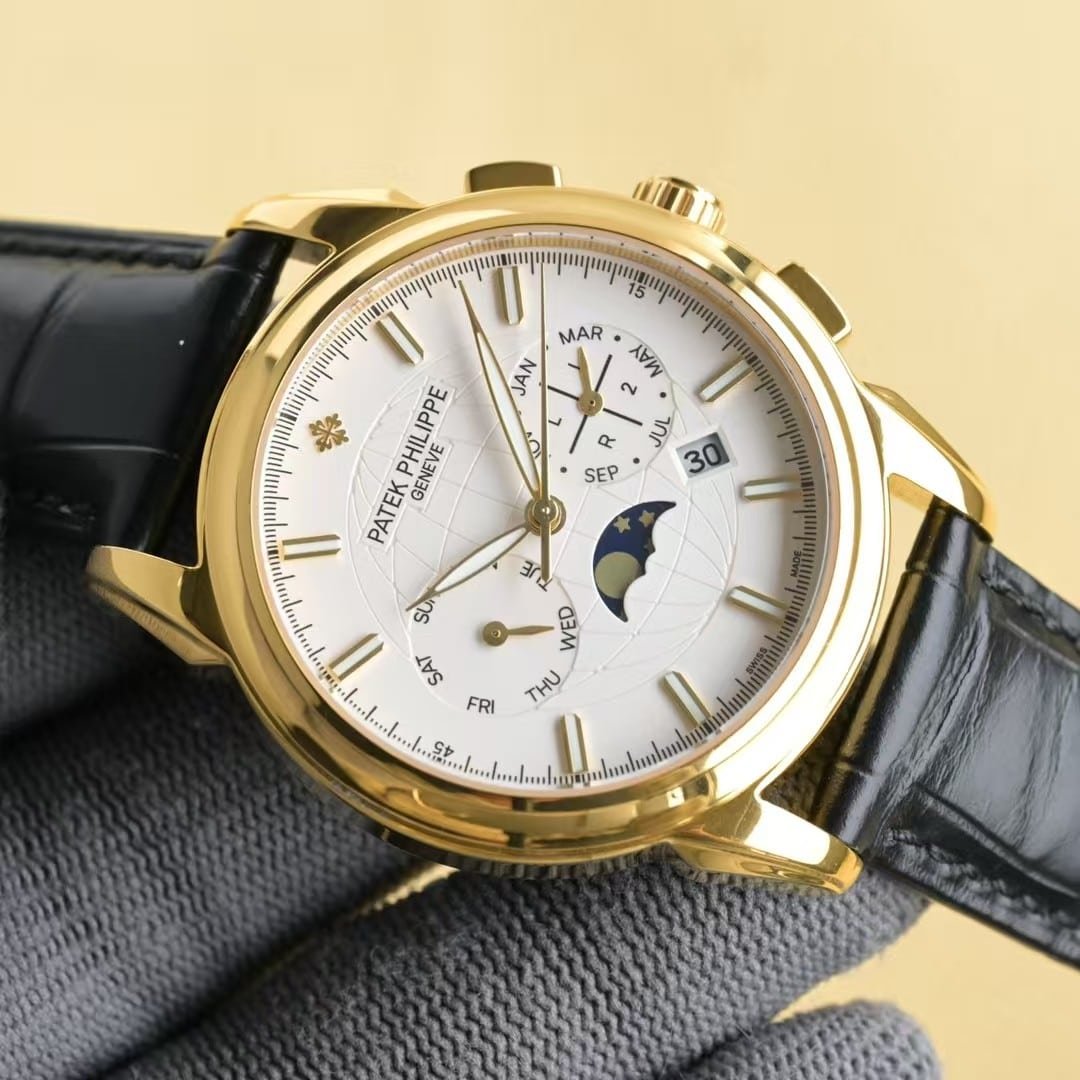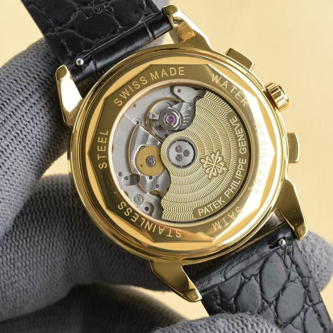 PPF’s gold plating tone mirrors the honey-yellow hue of genuine 18K gold, rather than the dull brass tone common in generic imitations. The dial’s depth and clarity — with crisp calendar windows and sharp printing — are indistinguishable from the authentic reference at a glance.