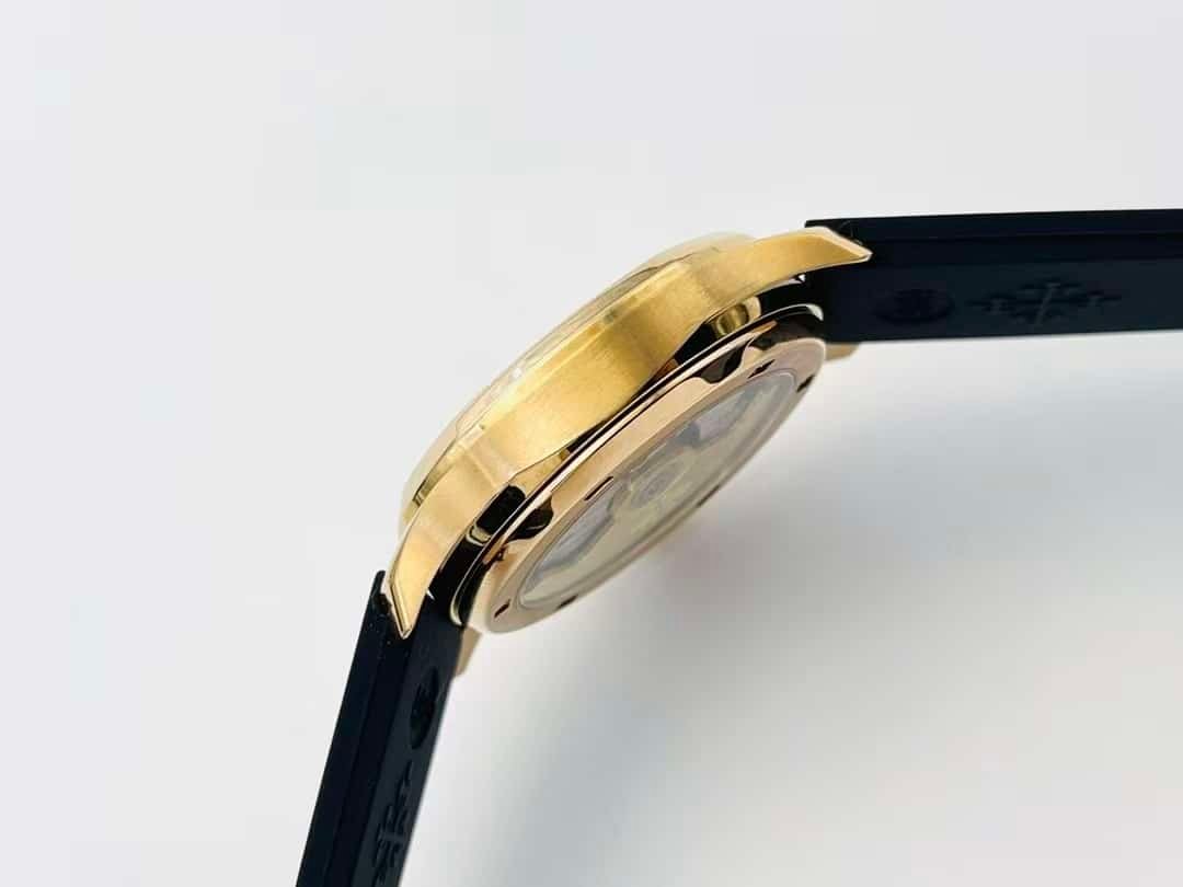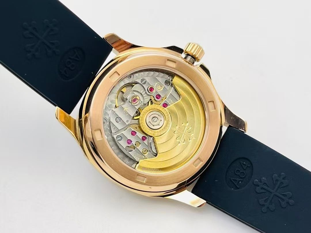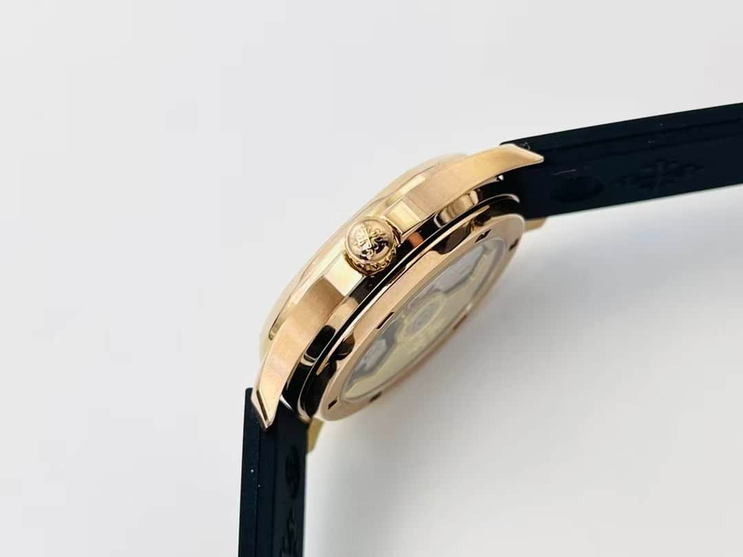 The 904L rose gold plating offers rich, soft tonality that changes subtly with light — warmer under sunlight, cooler indoors — perfectly mimicking the genuine Aquanaut Luce Ref. 5068R.