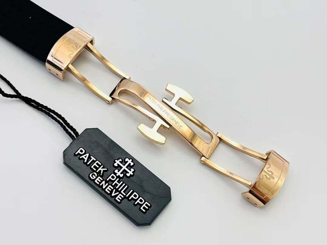 The smoky grey dial is where subtlety meets sophistication. The embossed pattern reflects Patek Philippe’s signature checker motif, adding depth that enhances the brilliance of the rose gold numerals.