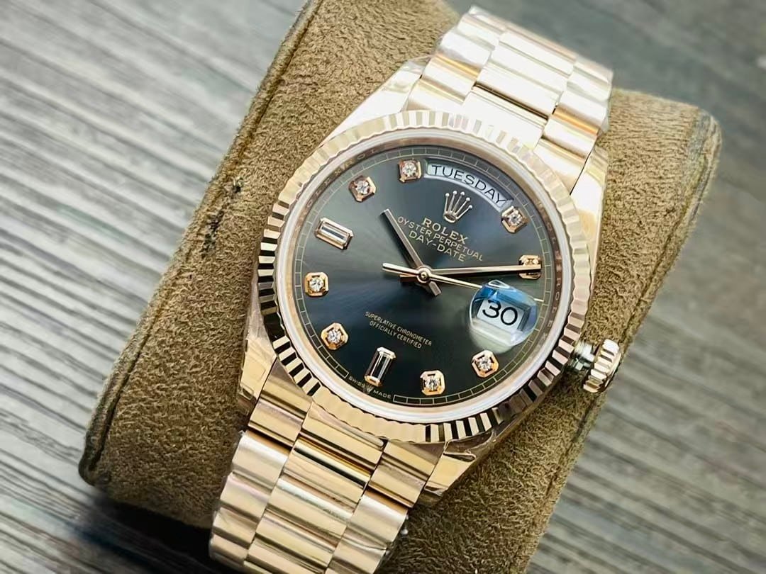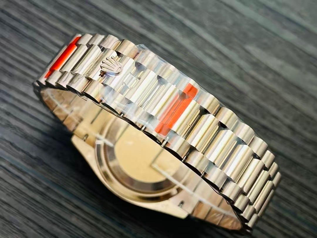 This configuration is modeled after the Rolex Day-Date 40 ref. 228238, a full yellow-gold build paired with a grey sunburst dial and diamond markers. While many gold-style Day-Date replicas go for a loud finish, this version leans toward a calmer, darker color temperature. The dial is cool, the gold tone is warm, and the contrast creates a more restrained, elegant personality.