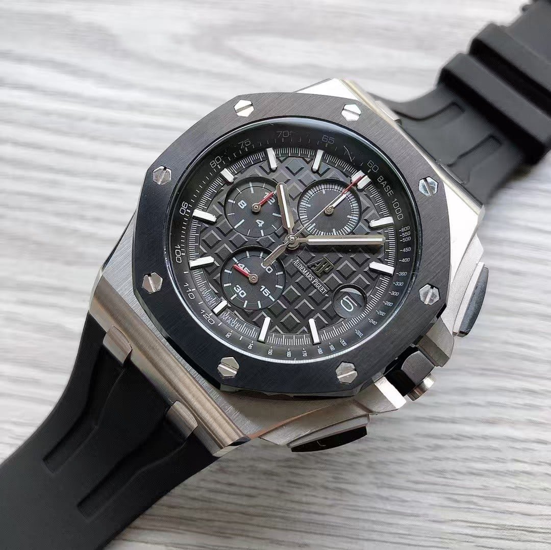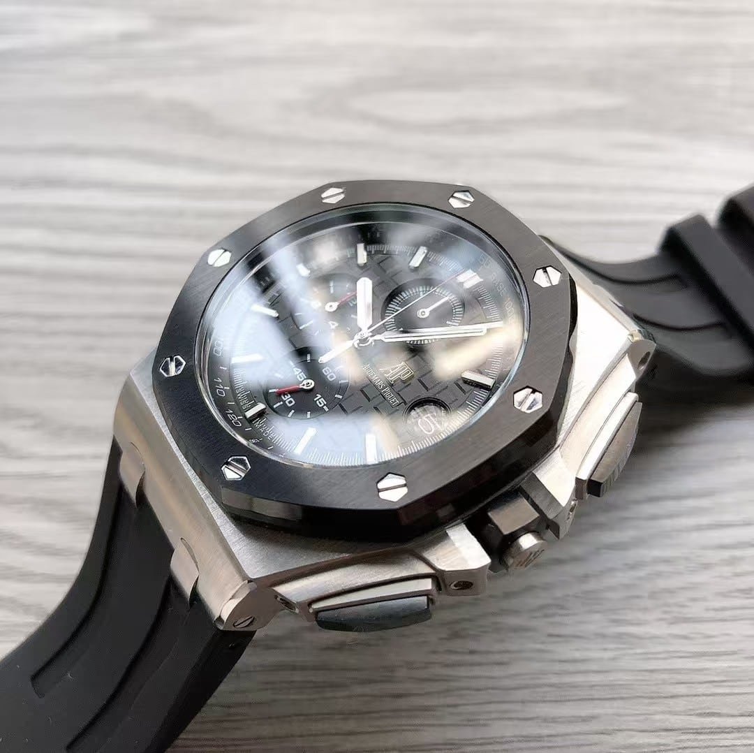 This APS Factory Royal Oak Offshore Chronograph captures everything enthusiasts love about the original — the solid feel, the commanding design, and that unmistakable AP wrist presence. It’s a watch built with intent. The brushed stainless-steel case feels robust yet refined, while the black ceramic bezel adds a stealthy edge that balances strength and style perfectly.