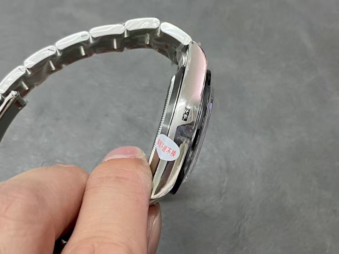 The case and bracelet are milled from solid 904L Oystersteel, the same corrosion-resistant alloy used in genuine Rolex models.