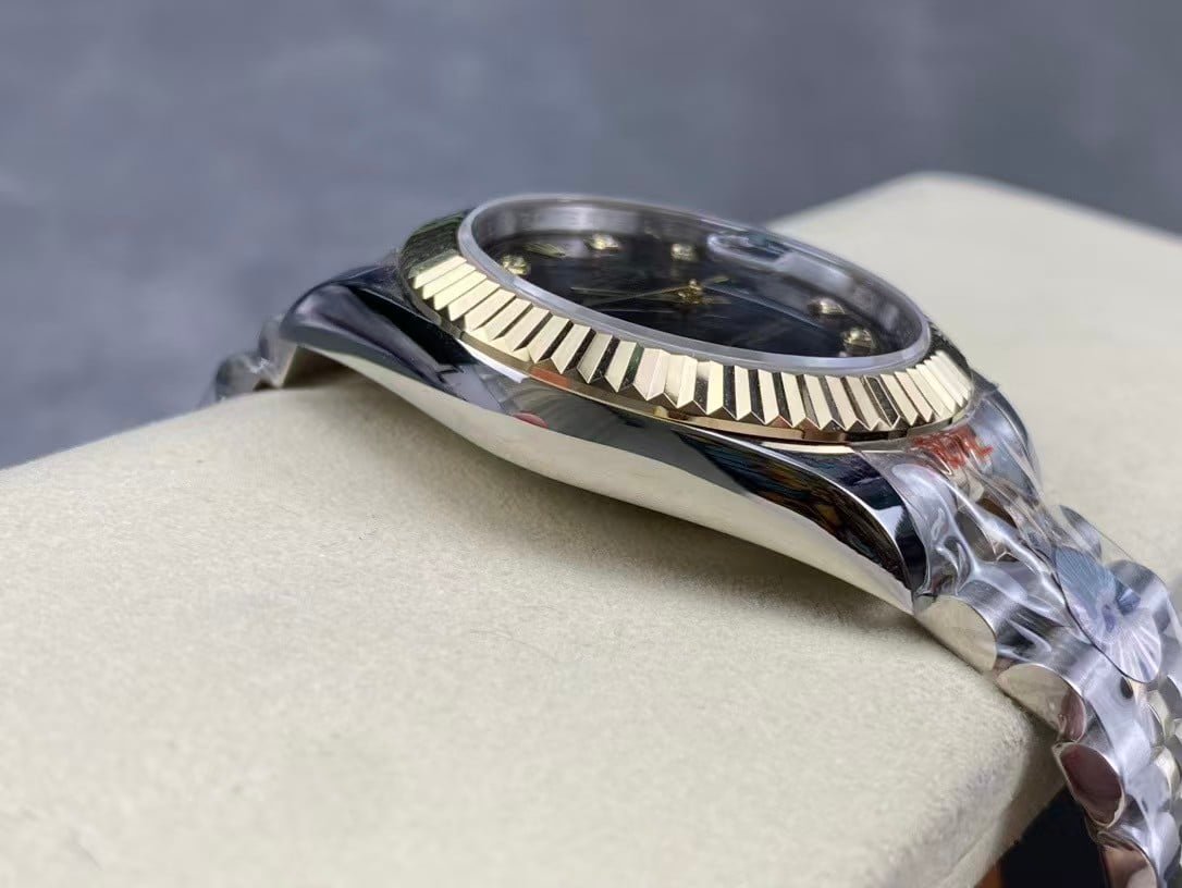 This piece passes QA when all mechanical functions operate smoothly and the visual elements maintain uniformity under varying lighting and wrist angles. The black dial, gold markers, and two-tone bracelet create a configuration that requires stricter standards, and the QA process reflects that.
