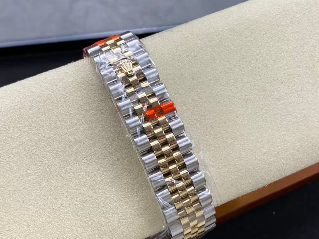 The fluted bezel is machined from gold-tone alloy with a multi-step cutting process. The ridges require consistent depth, otherwise the reflections break unpredictably. We inspect the bezel under both static light and moving light because differences only appear when the watch is rotated. The transition between polished steel lugs and the two-tone bracelet is another area we evaluate carefully. If the end links aren’t milled precisely, they create gaps or an uneven fit that can be felt immediately when the bracelet flexes.