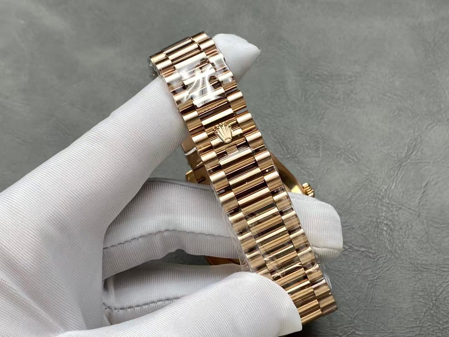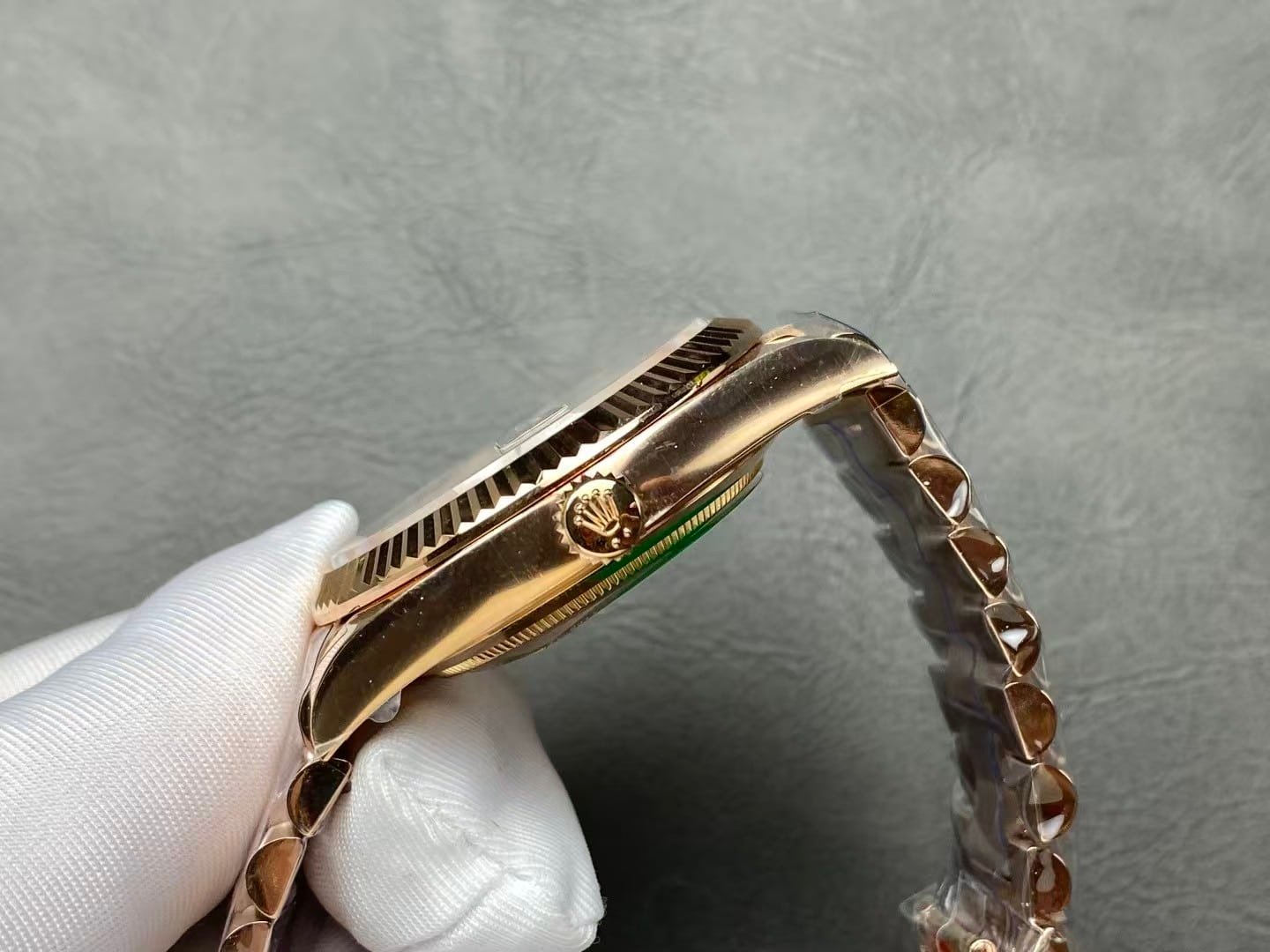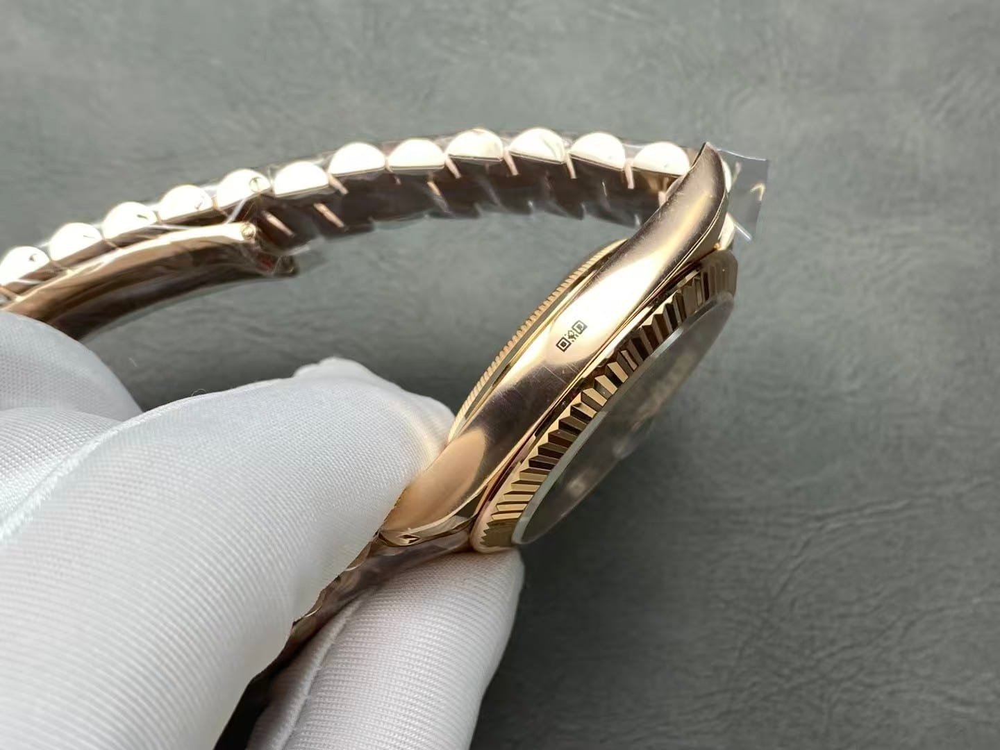 VS Factory’s 2024 edition mirrors this masterpiece with five-layer nano-brushed dial finishing, achieving a tone and reflectivity identical to the original Rolex 18K Everose Gold version. The Roman numerals are hand-applied and mirror-polished, while the fluted bezel is CNC-machined from 904L stainless steel, gold-coated at an atomic thickness to replicate the genuine Everose glow.