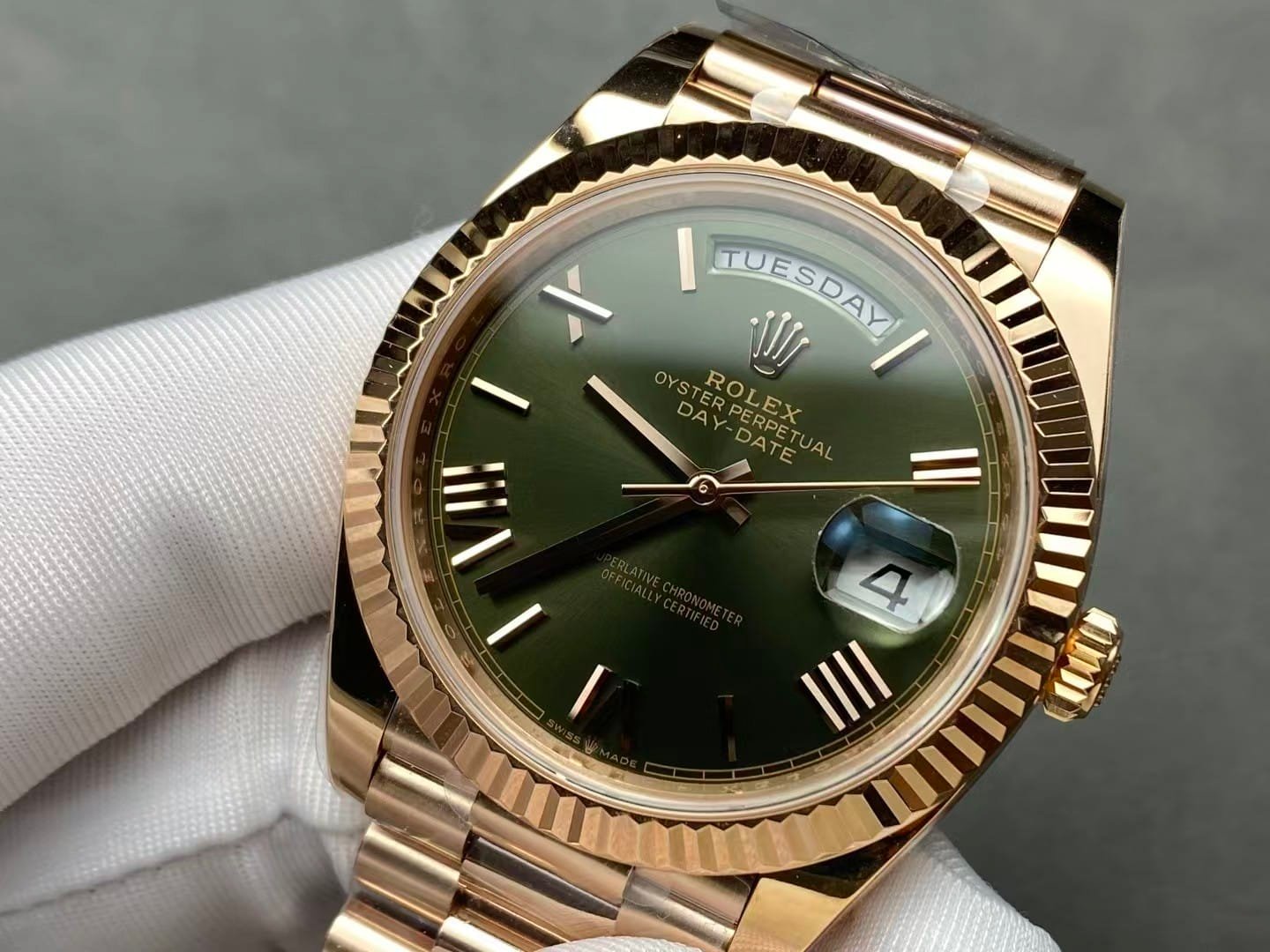 The Rolex Day-Date 40 Olive Green Dial represents a seamless fusion of tradition and innovation — warm, refined, and instantly recognizable. The soft metallic olive hue changes character from deep moss to subtle bronze under natural light, giving the watch a living, dynamic quality.