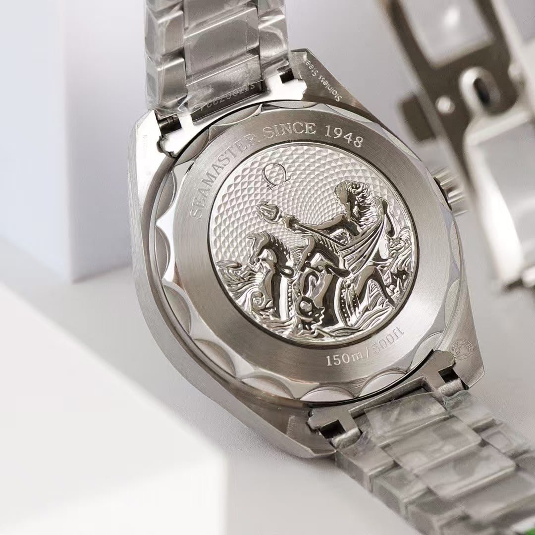 The brushed steel case and bracelet feel reassuringly solid, with smooth transitions between polished and satin finishes. The dial’s vertical “teak” texture gives it that signature Aqua Terra sophistication, while the sapphire crystal — clear, sharp, and anti-reflective — completes the visual depth. The VS Calibre 8938 automatic movement inside operates smoothly, offering strong timekeeping and stable power reserve that mirrors the feel of the genuine Omega mechanism.