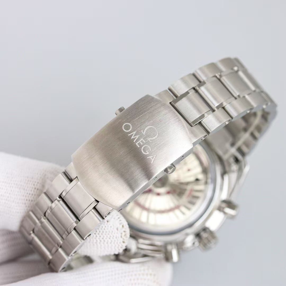 From the side profile to the pushers’ tactile feedback, the feel mirrors genuine Omega engineering. The solid-link bracelet, with alternating polished and brushed finishes, completes the professional aesthetic — designed for both daily wear and serious enthusiasts.