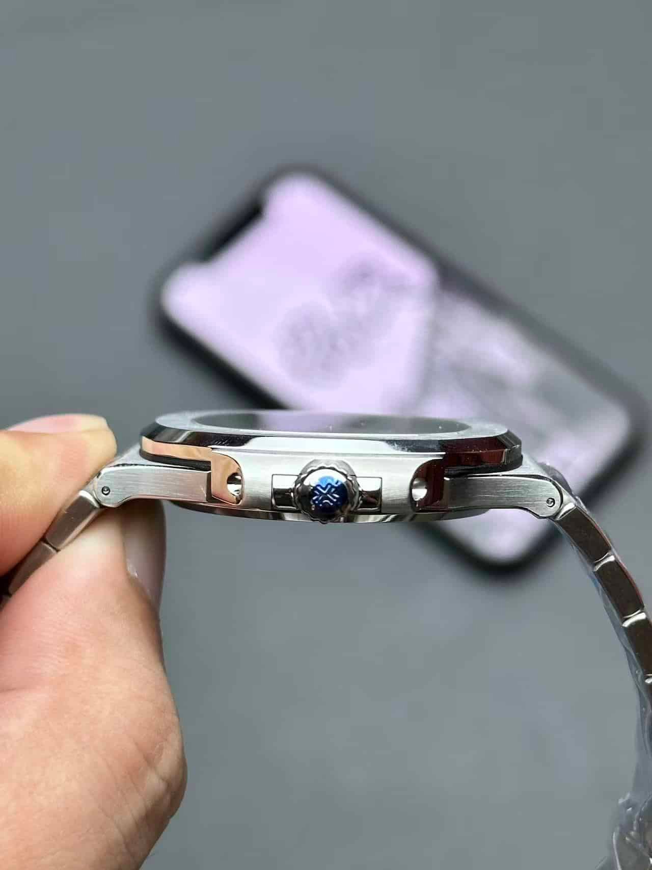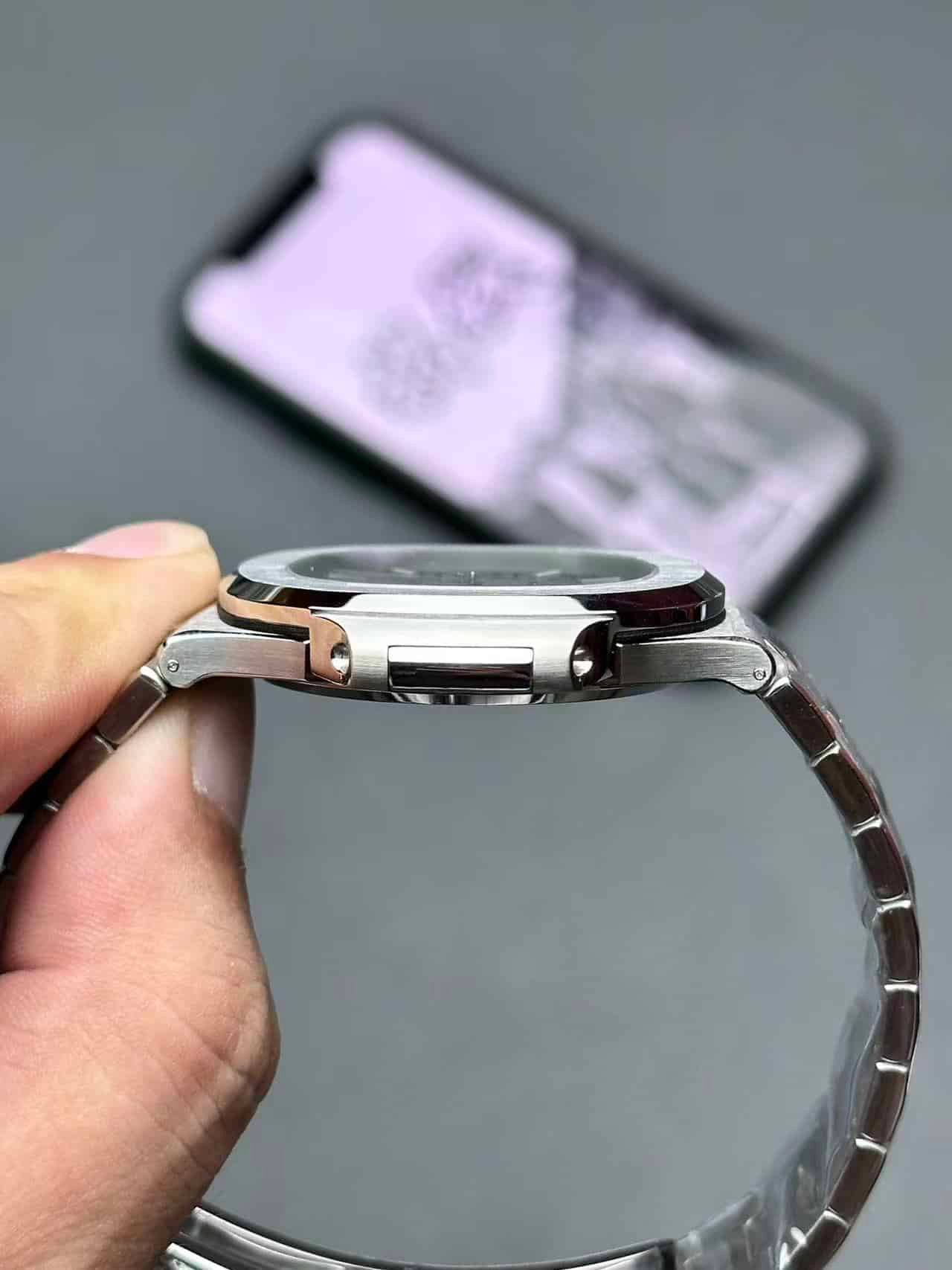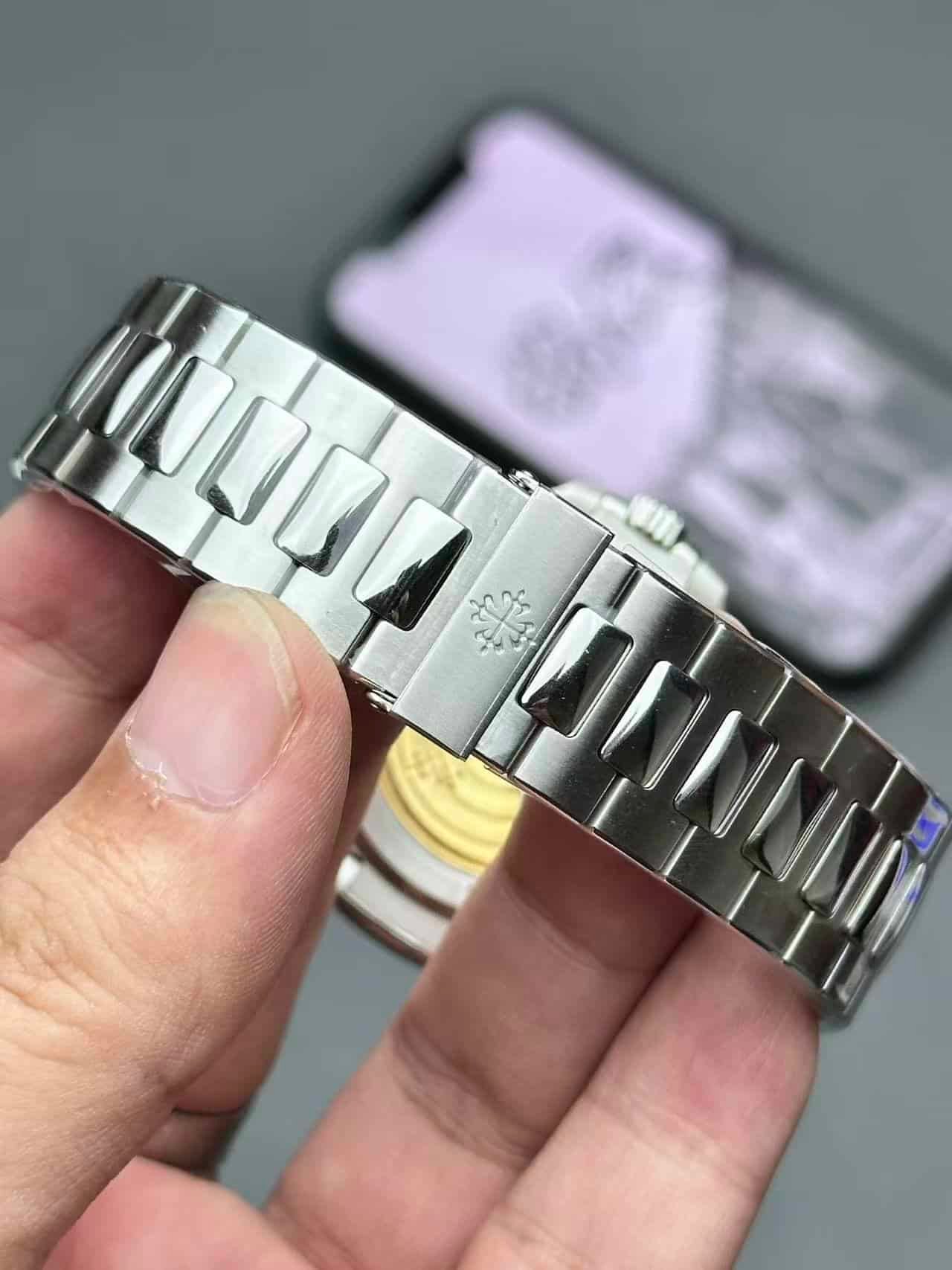 Each Nautilus V1 case is sculpted from solid steel through five-axis CNC machining, ensuring identical curves, bevels, and brushing direction as the original. The bracelet’s transition between polished center links and brushed side surfaces achieves a mirror-level reflection angle under 45° light, true to the genuine design.