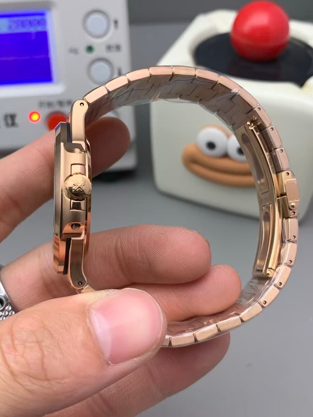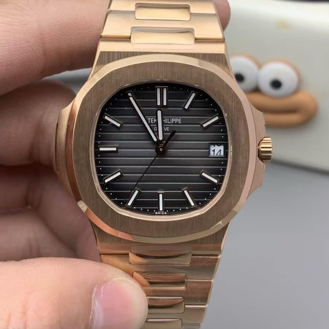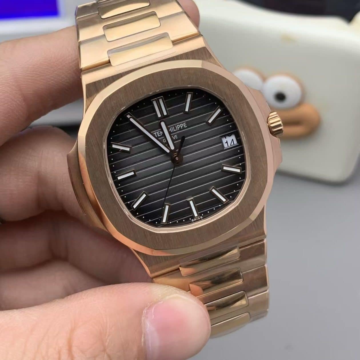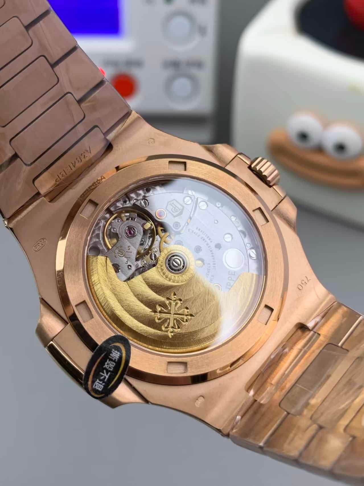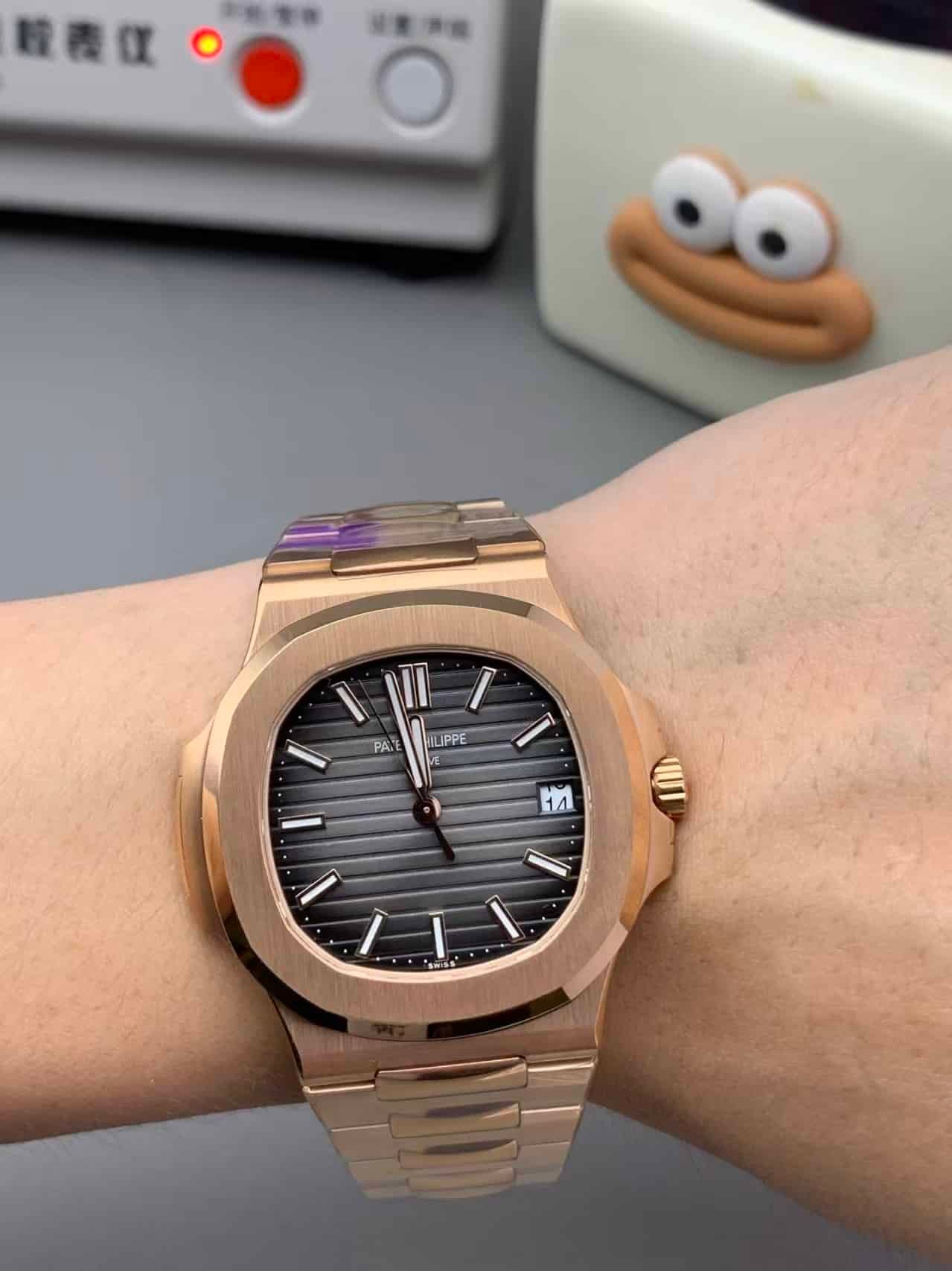 That commitment shows. Under natural light, the rose gold case shifts between champagne and bronze tones, while the black gradient dial deepens toward charcoal at the edges — exactly like the genuine 5711R.