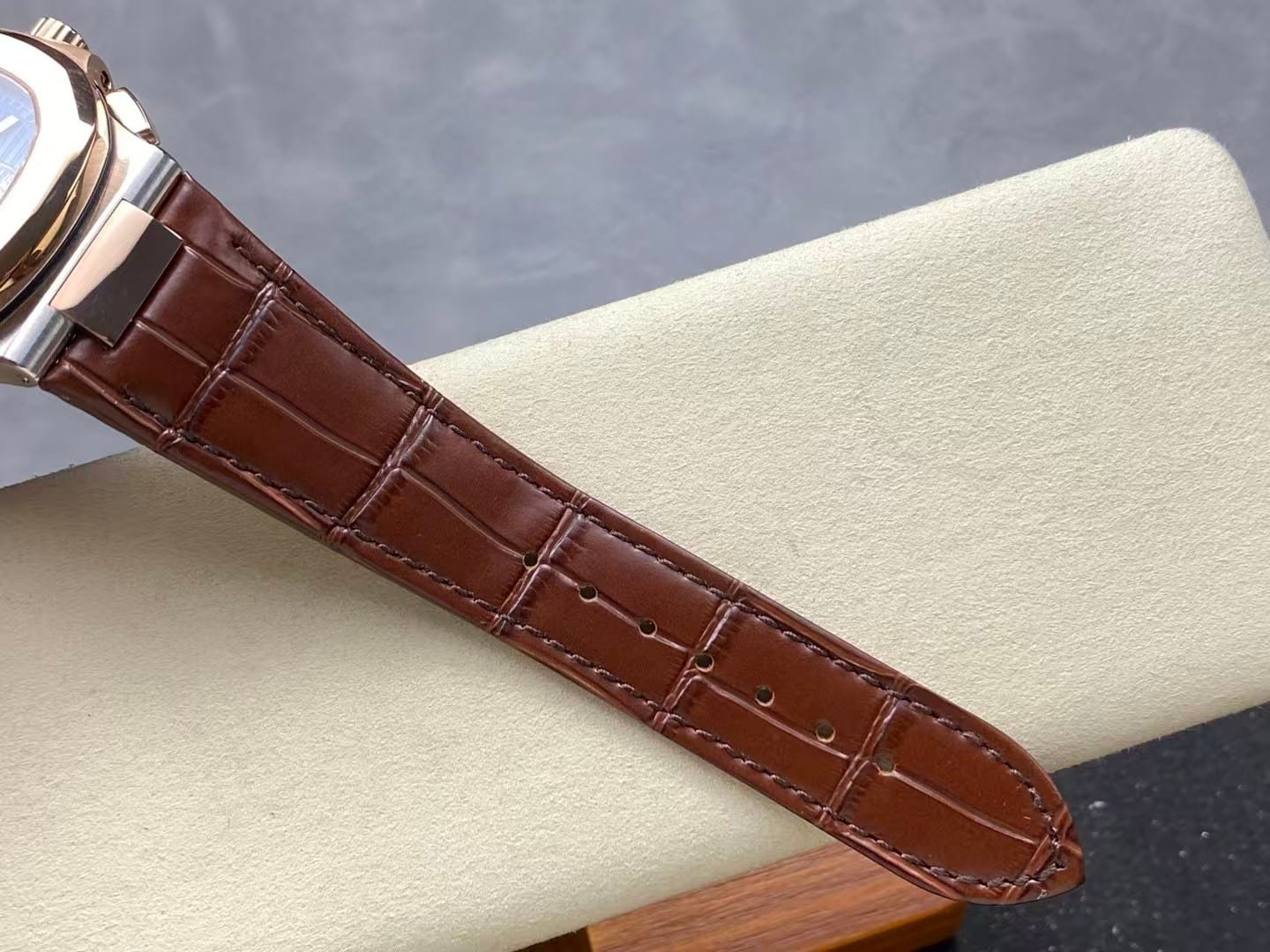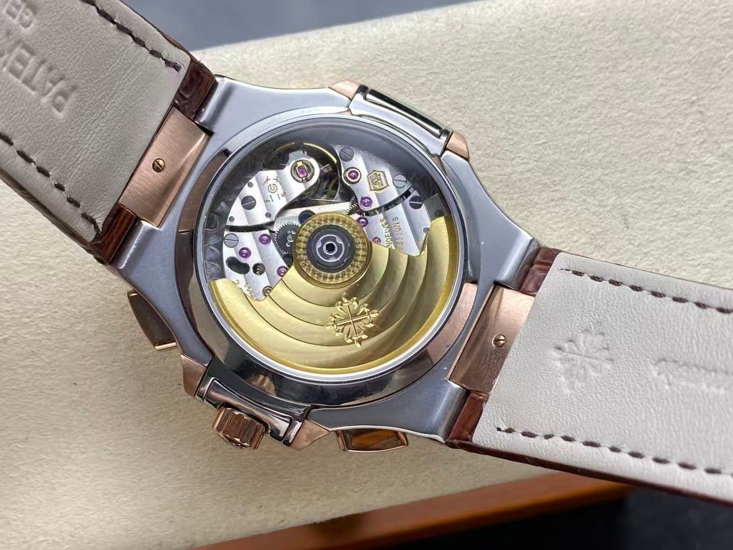 That obsession shows. The brushed rose-gold case reflects soft warmth, while the integrated steel mid-links and polished accents maintain the Nautilus DNA that collectors around the world respect.
