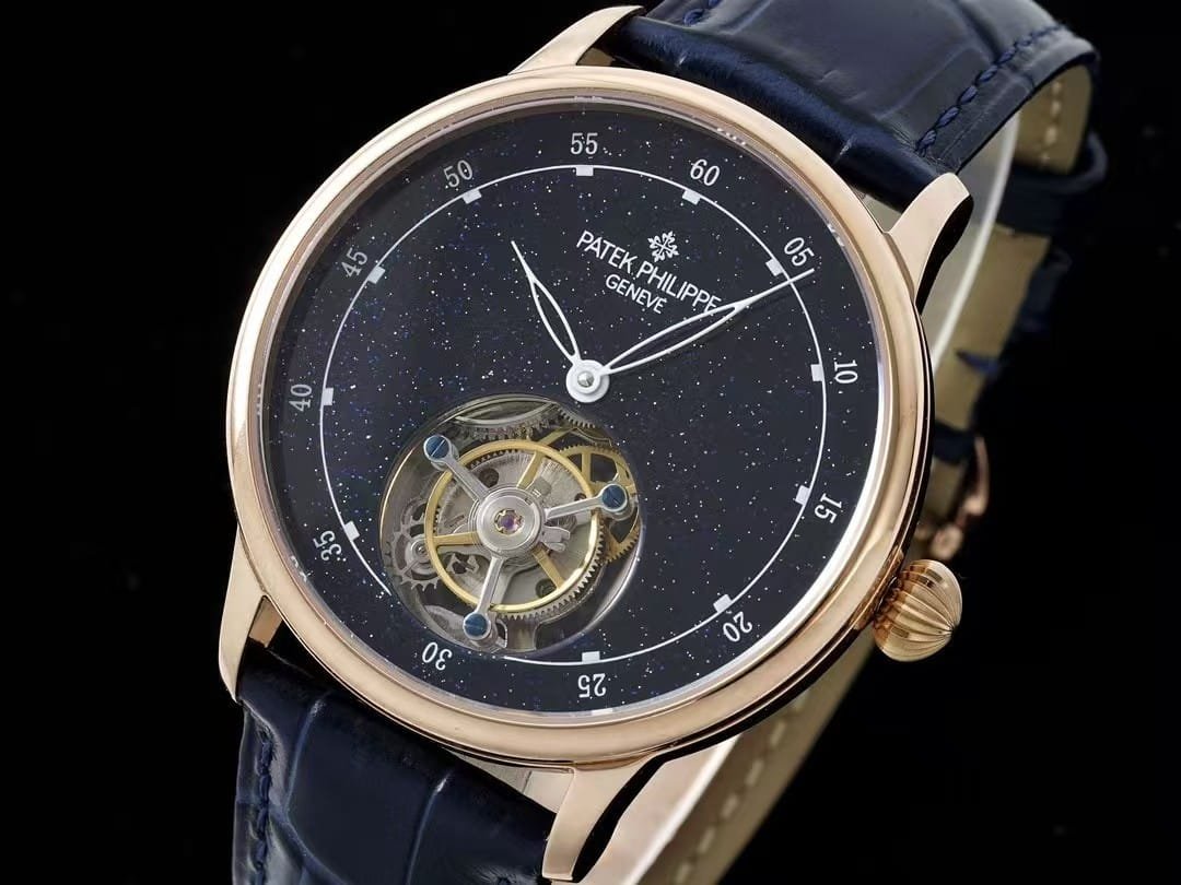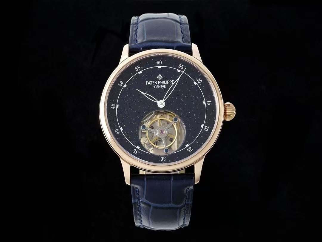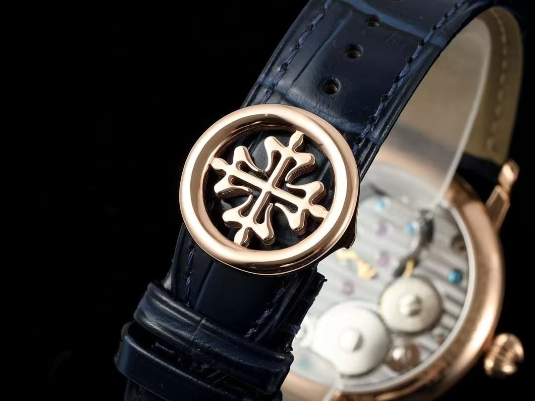 Paired with rose-gold indices and slender leaf-shaped hands, the visual composition achieves the same sense of balance as the genuine Patek Philippe 5303R — timeless and cosmic.