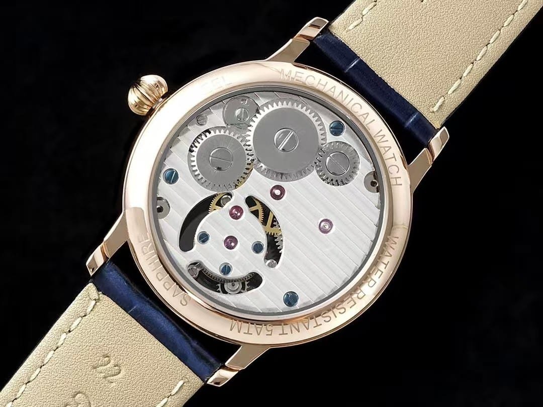 The case measures 41mm, crafted from 904L steel with 18K rose-gold plating so refined that it mimics the hue of genuine Patek rose gold (5N alloy).