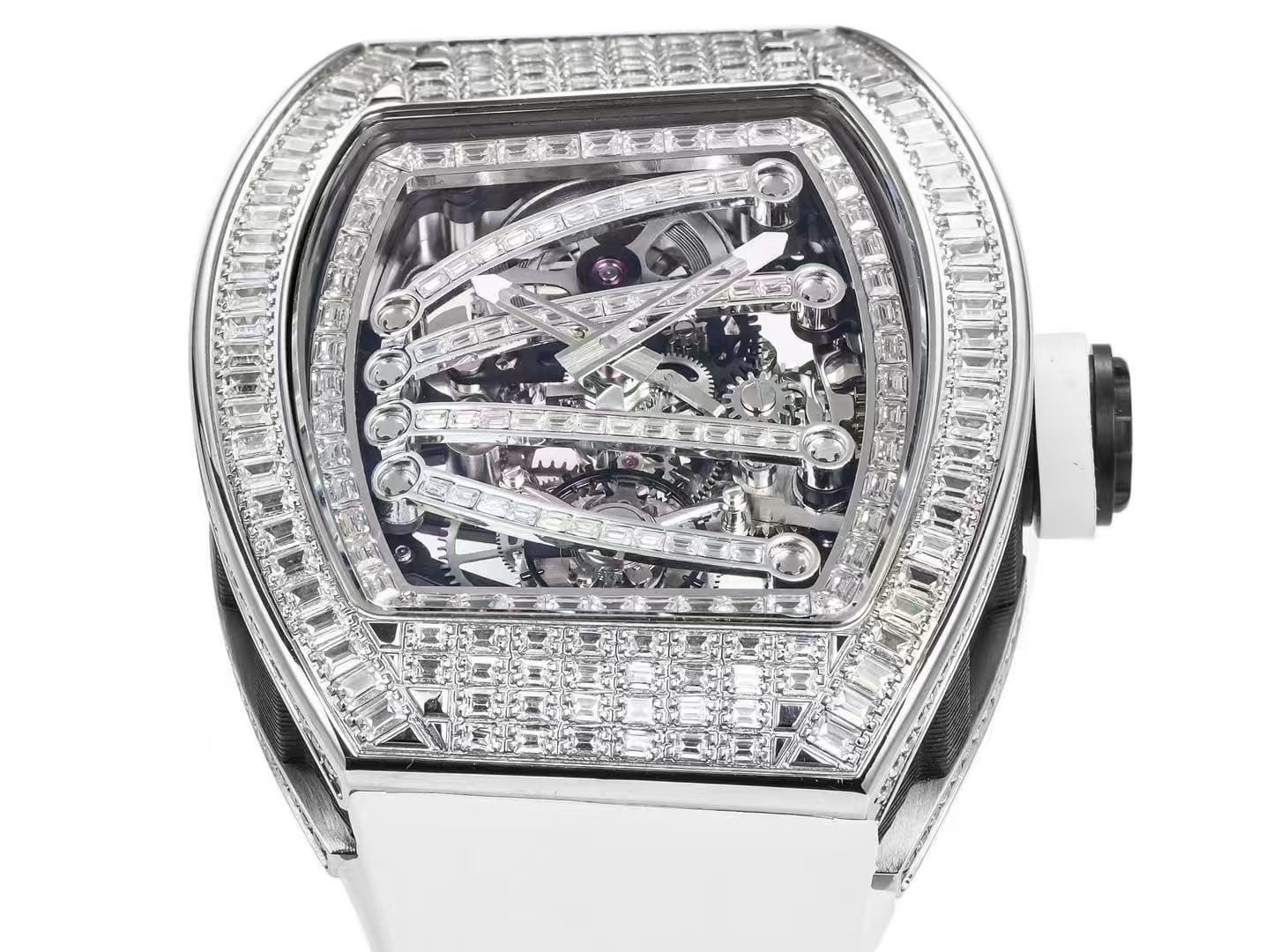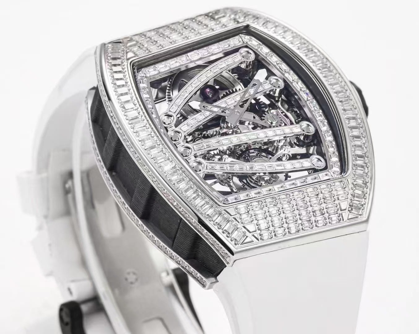 Every facet and cut line of the baguette stones follows the same curvature as the authentic version, and the skeleton bridges preserve the watch’s modern-mechanical personality. The harmony between glitter and precision — between fine jewelry and engineering — makes this model a favorite among collectors who appreciate both aesthetic mastery and horological design.