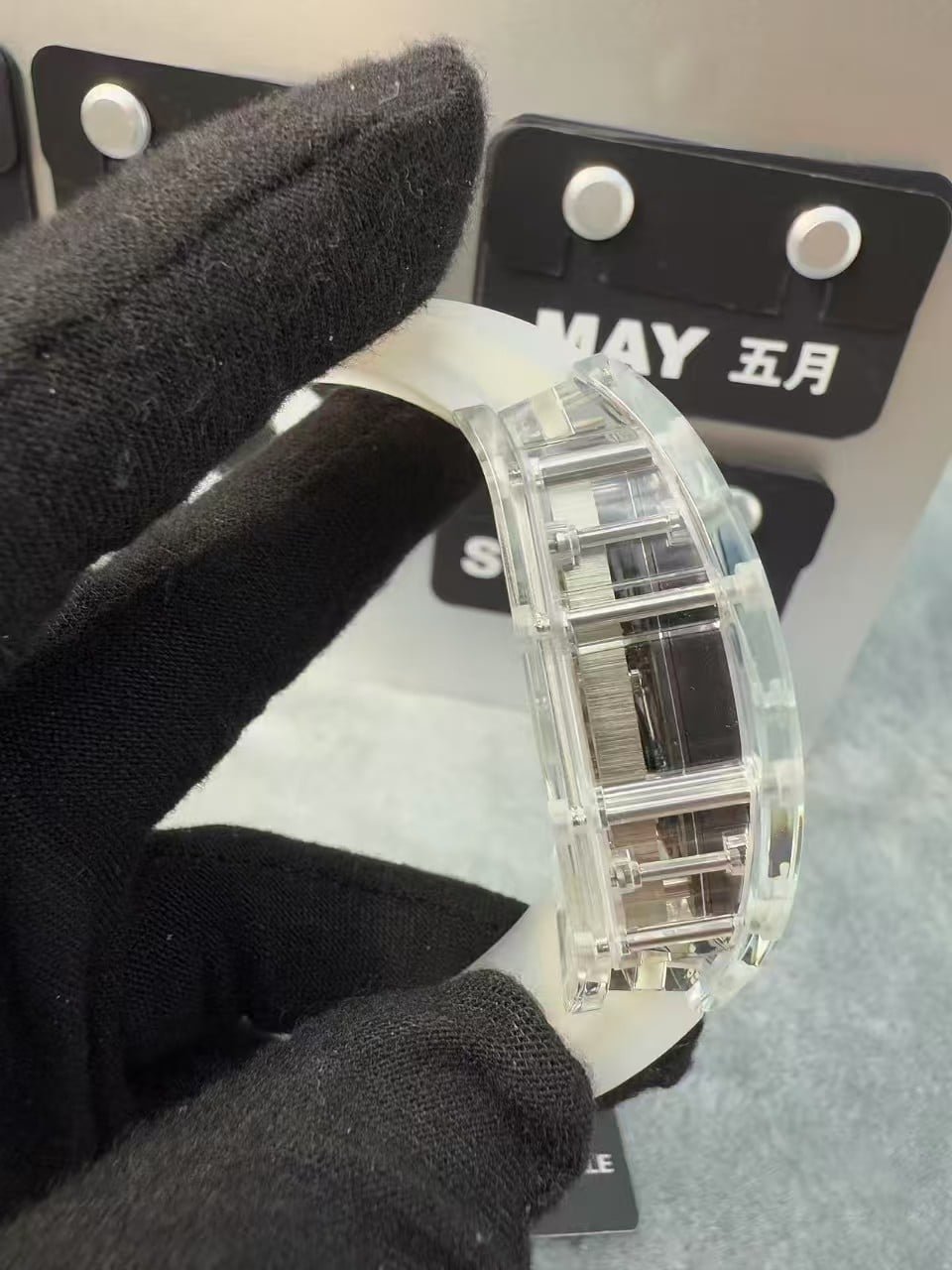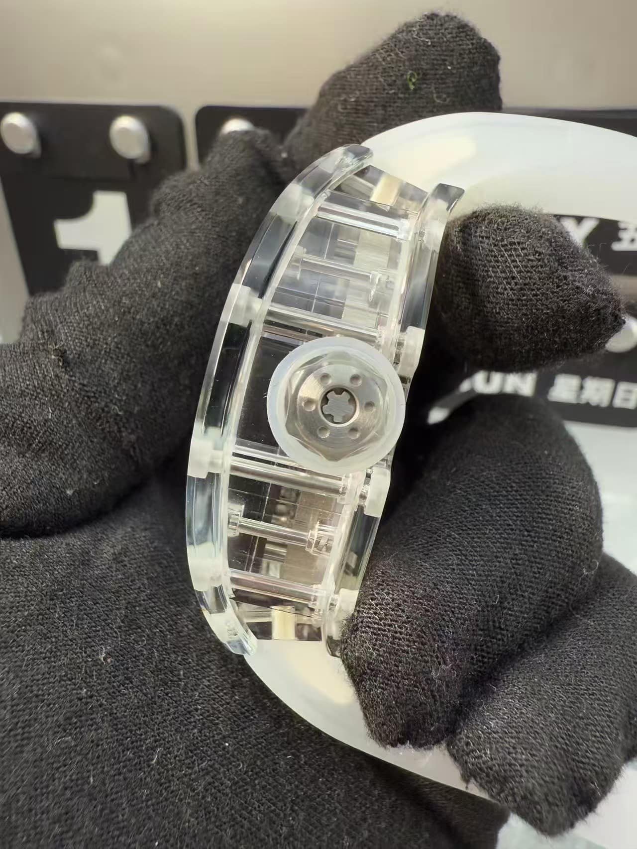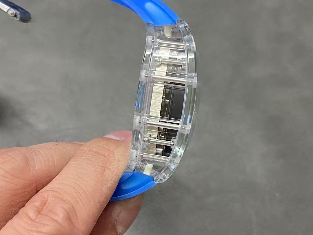 APS Factory’s craftsmanship brings this experience to life with uncanny accuracy. The clear sapphire case feels cool and solid, its edges flawlessly polished. Under light, the black-and-silver movement reflects a subtle blue tint through the sapphire surface, just like the genuine RM12-01. On the wrist, it’s both futuristic and refined — a showcase of ultra-modern horology through Chinese precision manufacturing.