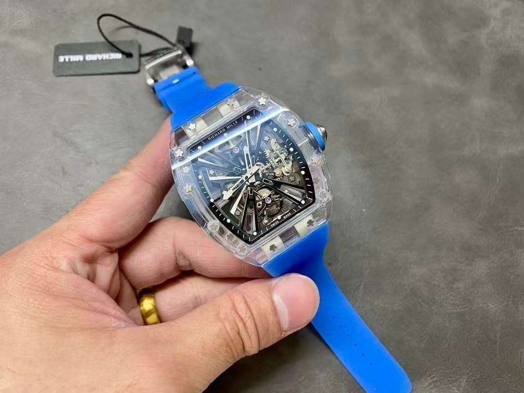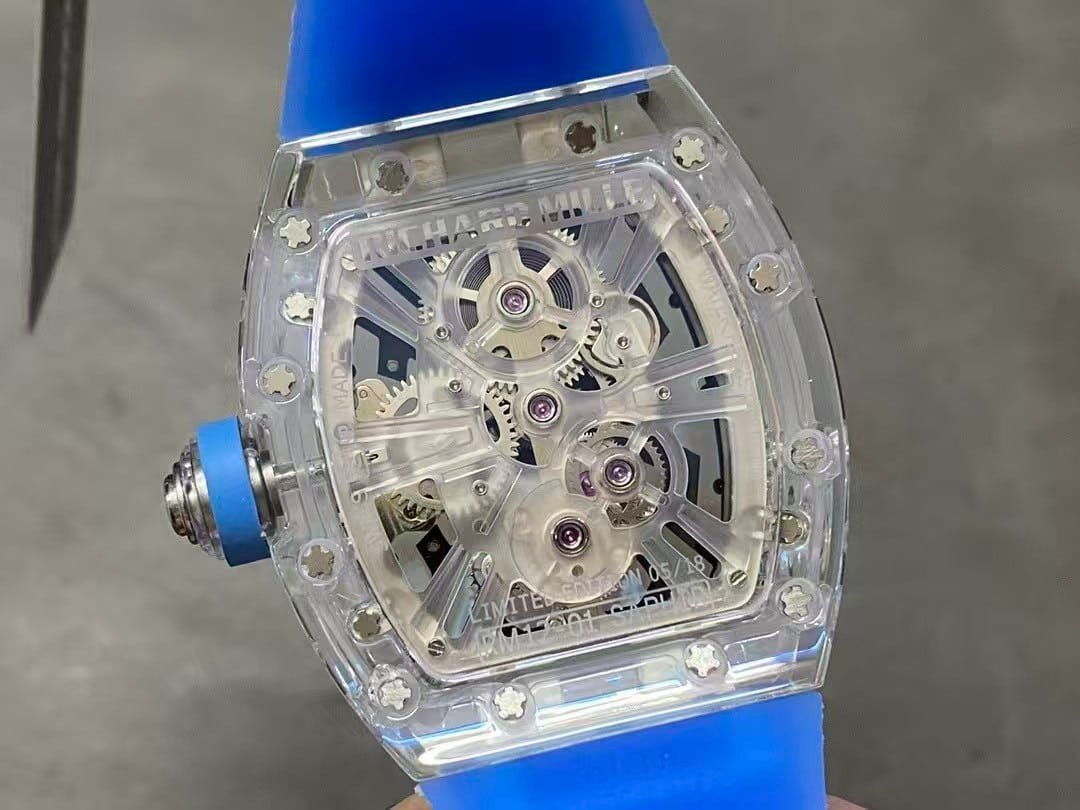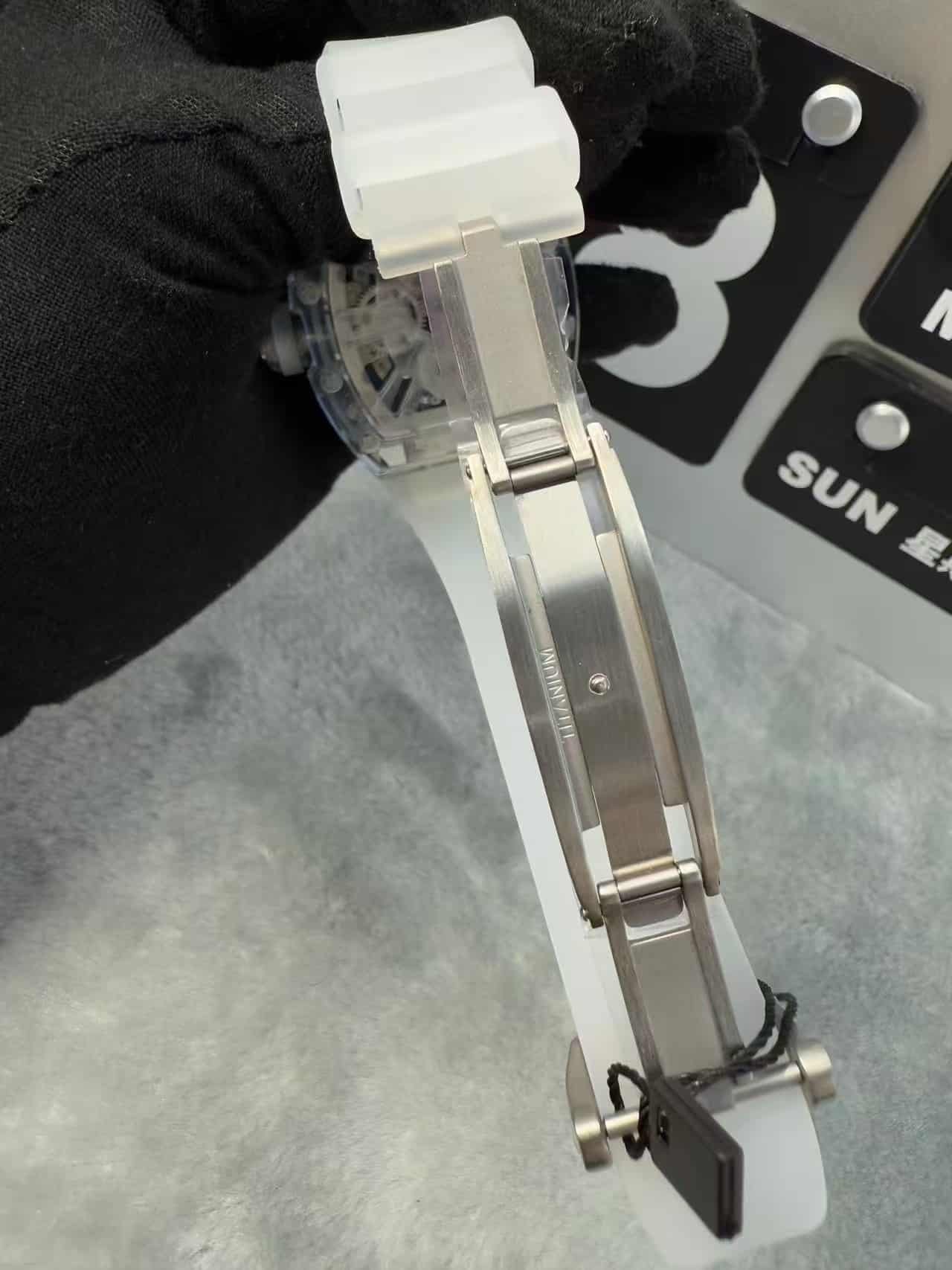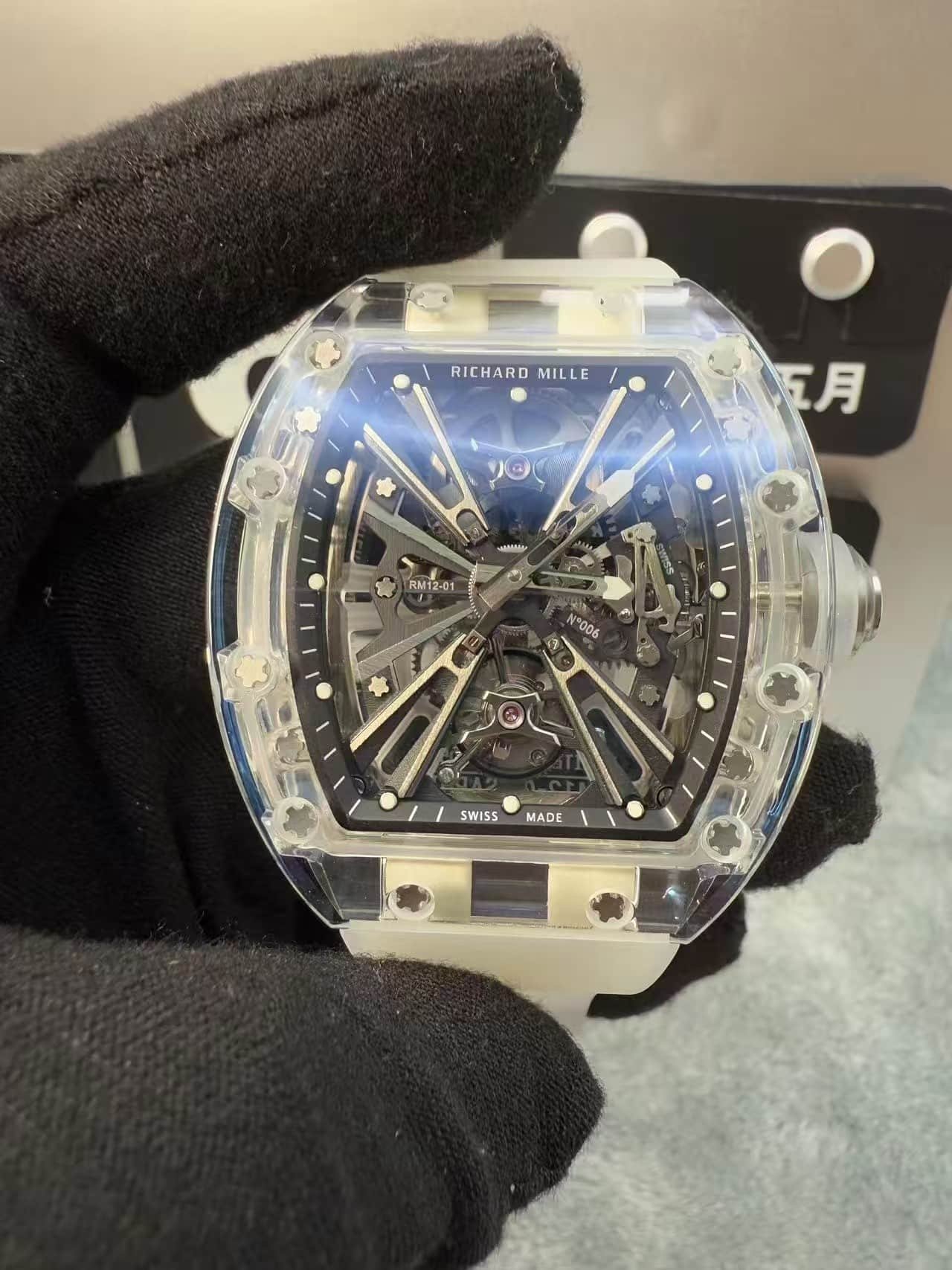 APS Factory’s craftsmanship brings this experience to life with uncanny accuracy. The clear sapphire case feels cool and solid, its edges flawlessly polished. Under light, the black-and-silver movement reflects a subtle blue tint through the sapphire surface, just like the genuine RM12-01. On the wrist, it’s both futuristic and refined — a showcase of ultra-modern horology through Chinese precision manufacturing.